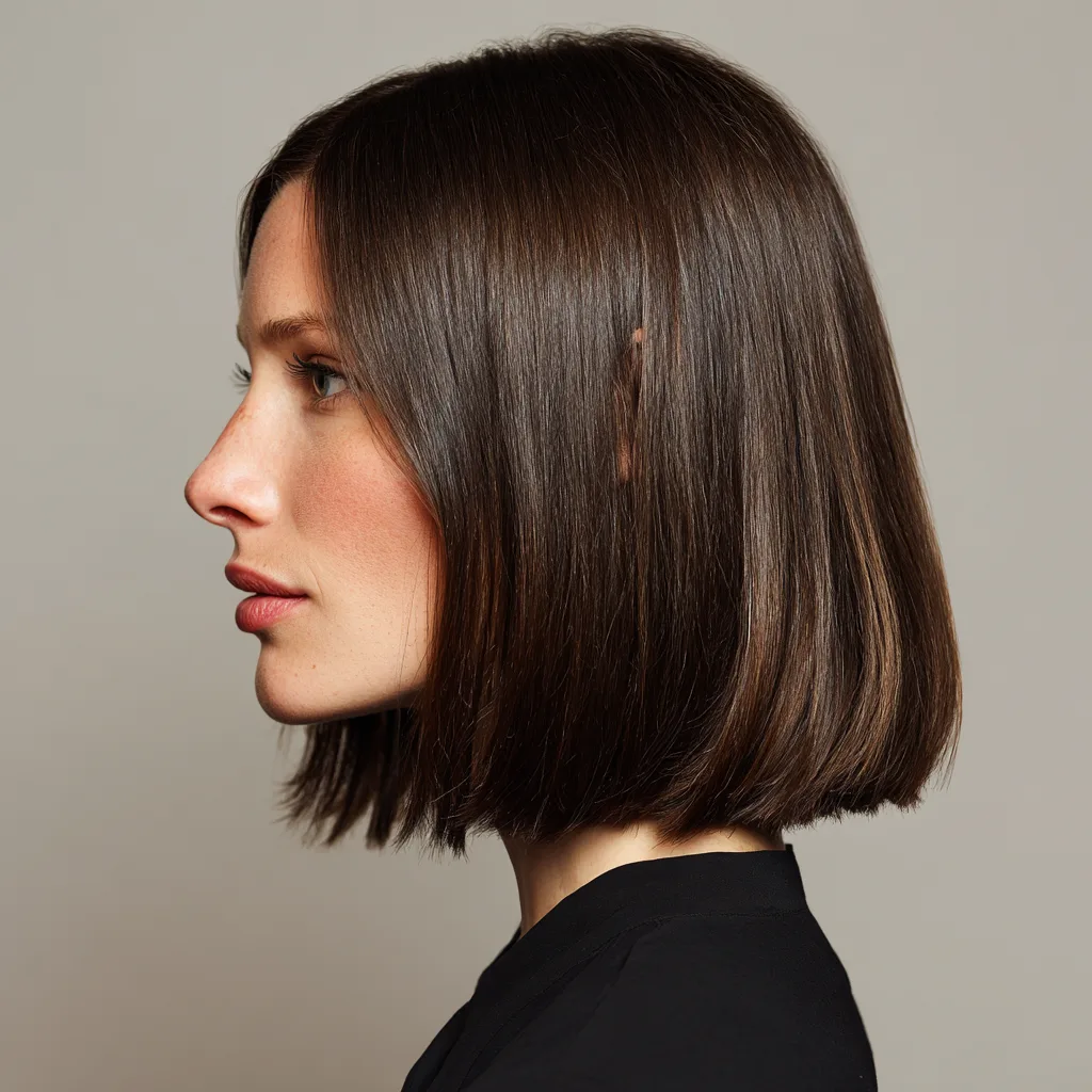 This haircut keeps a clean outline while hiding layers inside the shape. It works best for thick straight or slightly wavy hair. The blunt edge gives structure, while internal layers prevent heaviness. It flatters longer face shapes by adding width and balance.