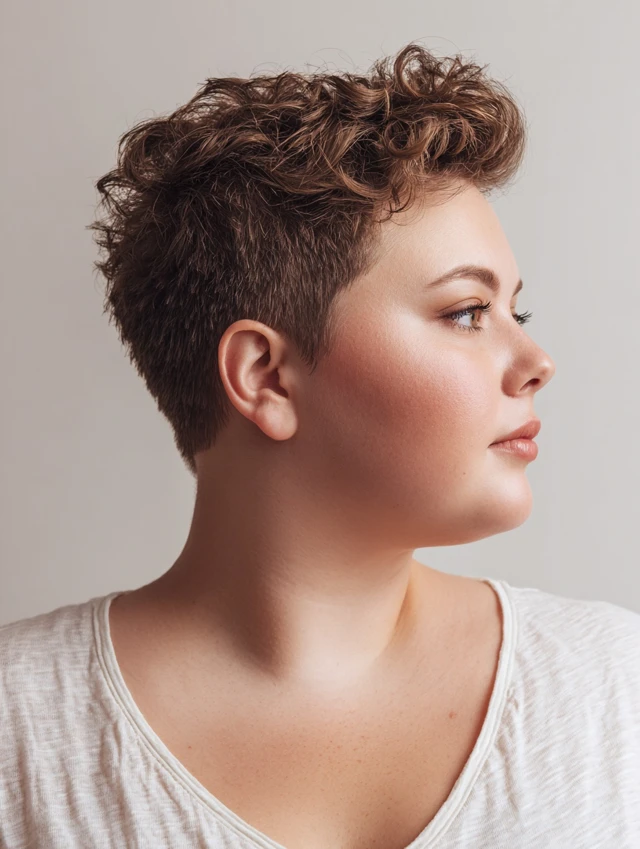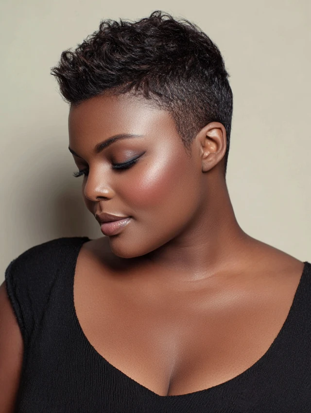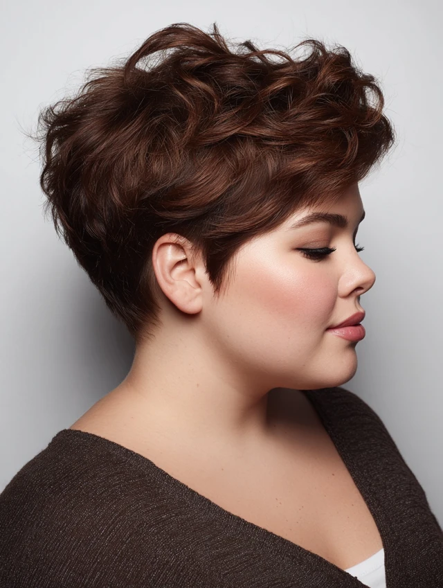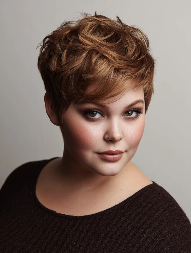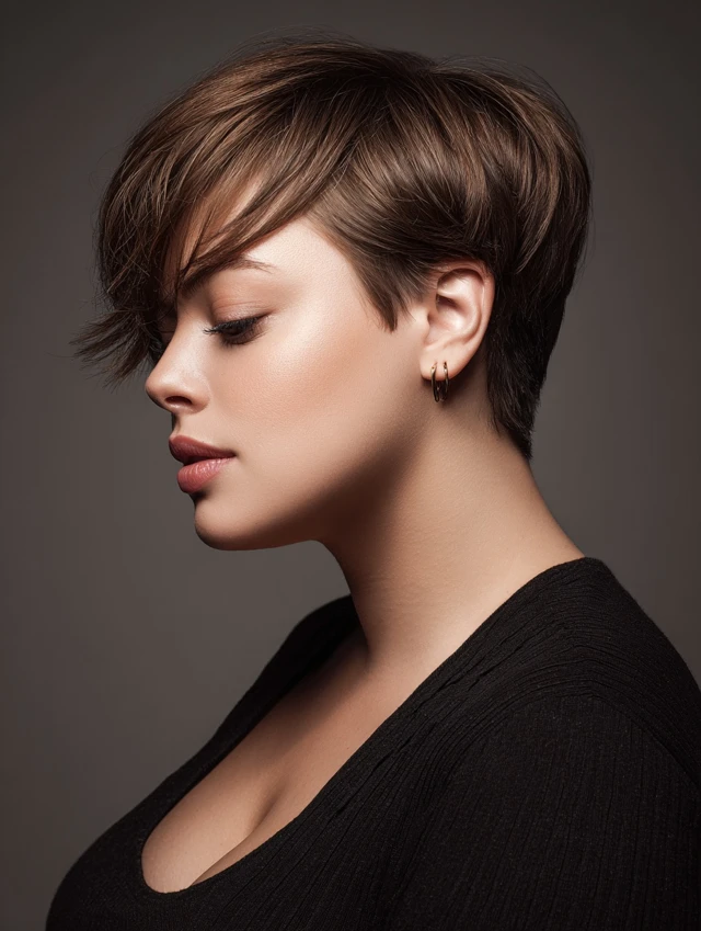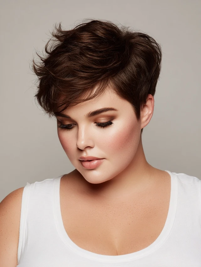 A layered pixie cut adds height and movement at the crown, which helps balance fuller features. The layers keep the style light and prevent the cut from looking too close to the head. This shape creates a clean, modern outline.