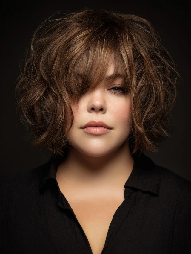 An asymmetrical cut features uneven lengths that draw attention diagonally across the face. This breaks up fullness and adds visual interest. The shape feels bold but still wearable.