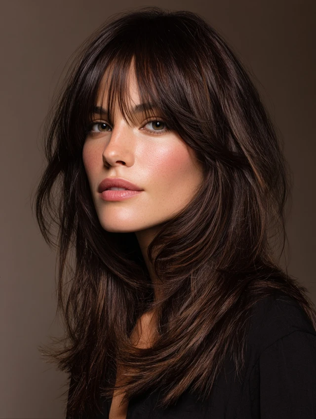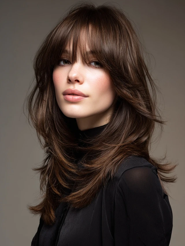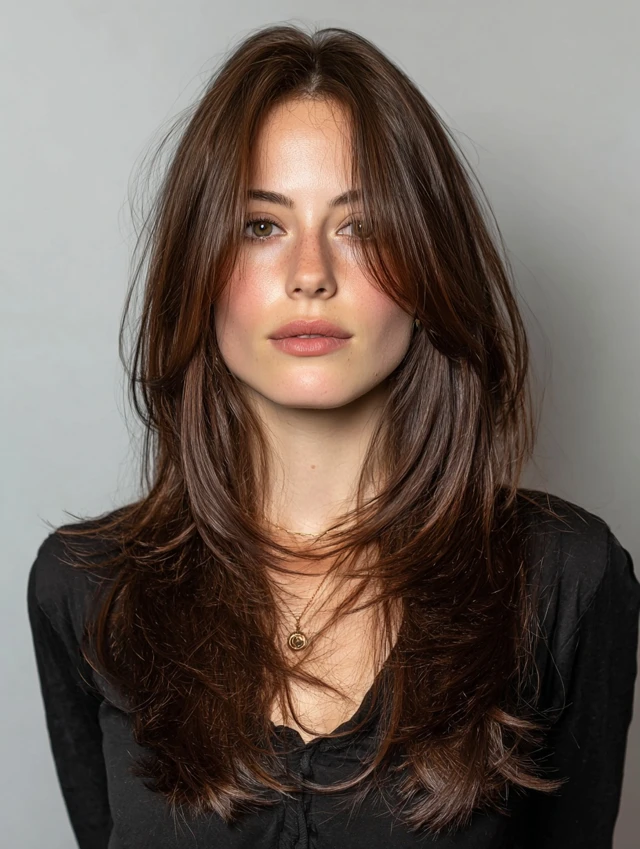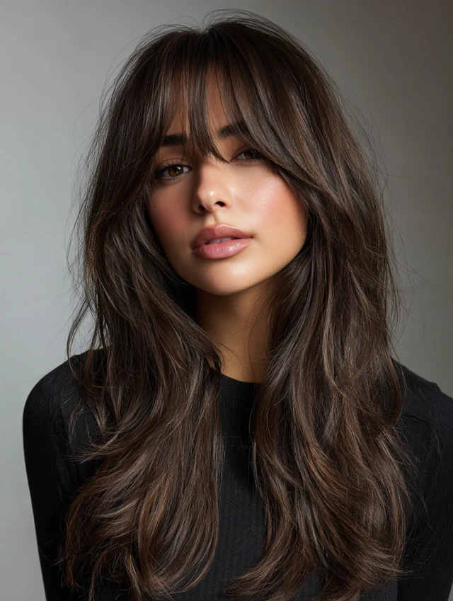 This cut features long layers with curtain bangs that frame the face softly. The layers add movement and prevent long hair from looking flat.