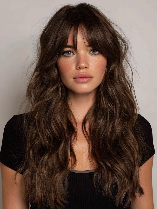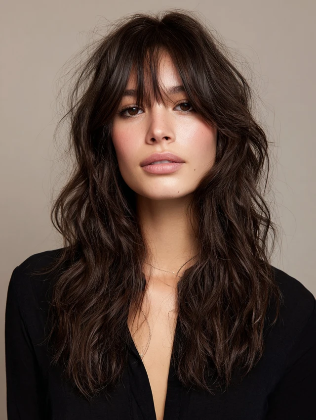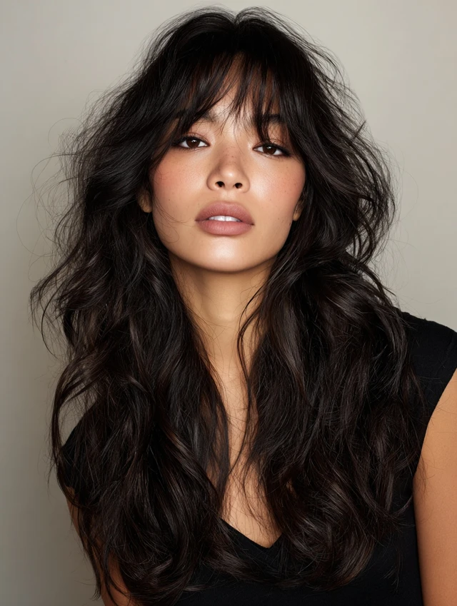 Textured layers and bangs add dimension to long hair, creating a lived-in, edgy look. The choppy ends enhance volume and reduce heaviness.