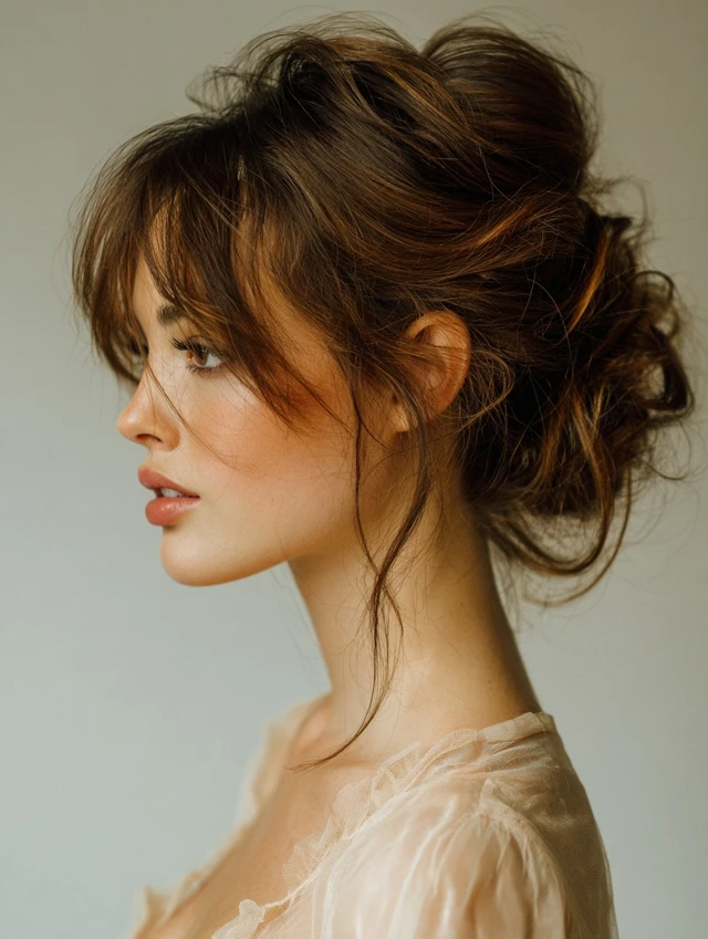 A twisted side bun positions hair to one side, adding asymmetry and sophistication. Layers create movement, making the style look fuller and more dynamic.