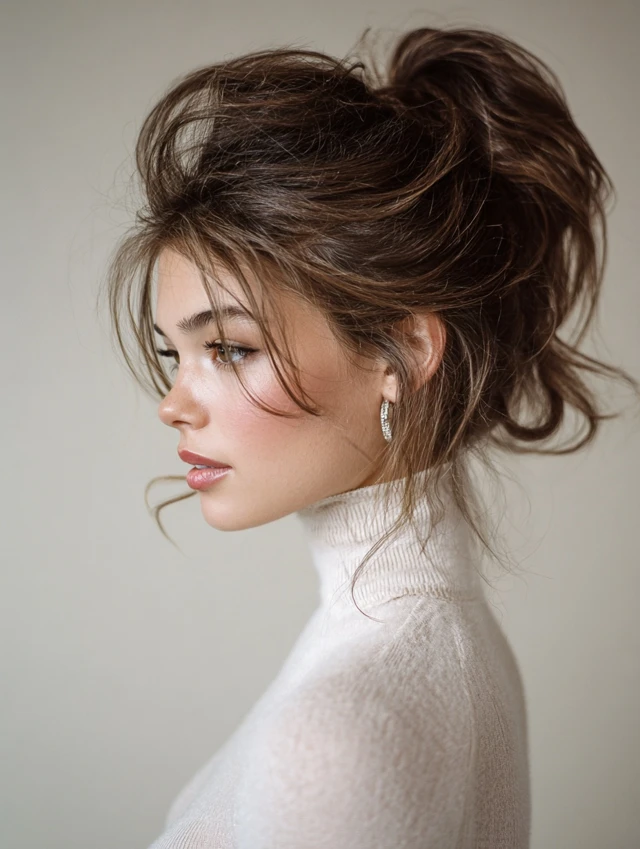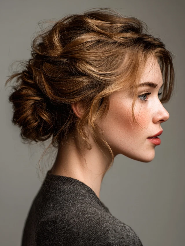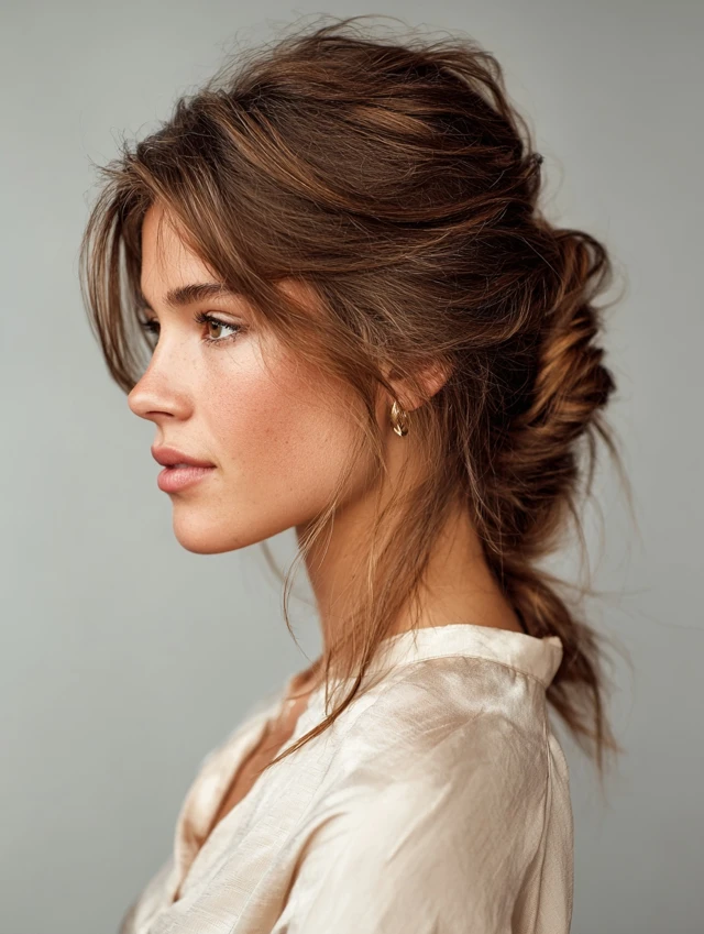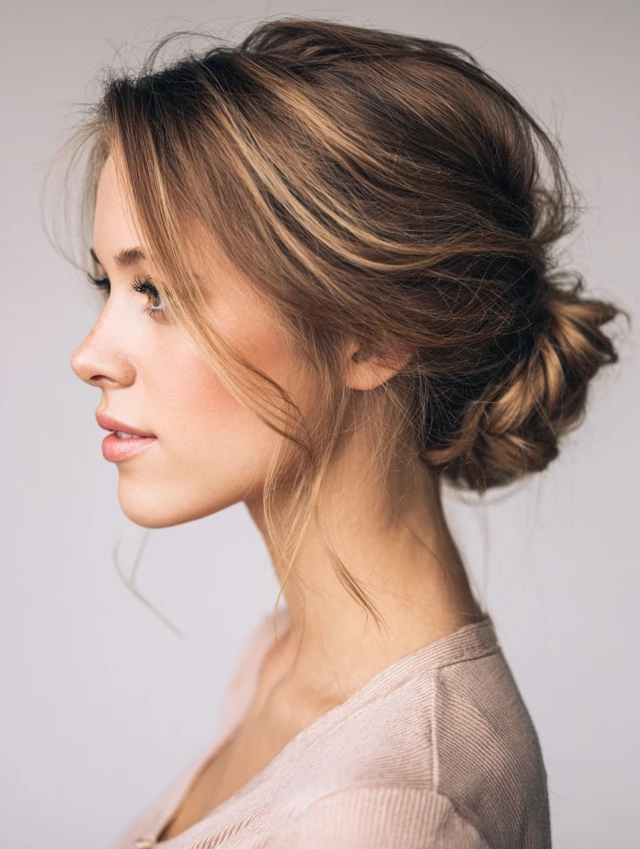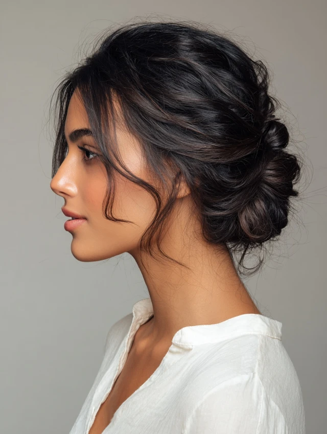 A low messy bun creates a relaxed, effortless look while keeping medium hair off the face. Layers and texture prevent the bun from looking flat, giving natural volume.