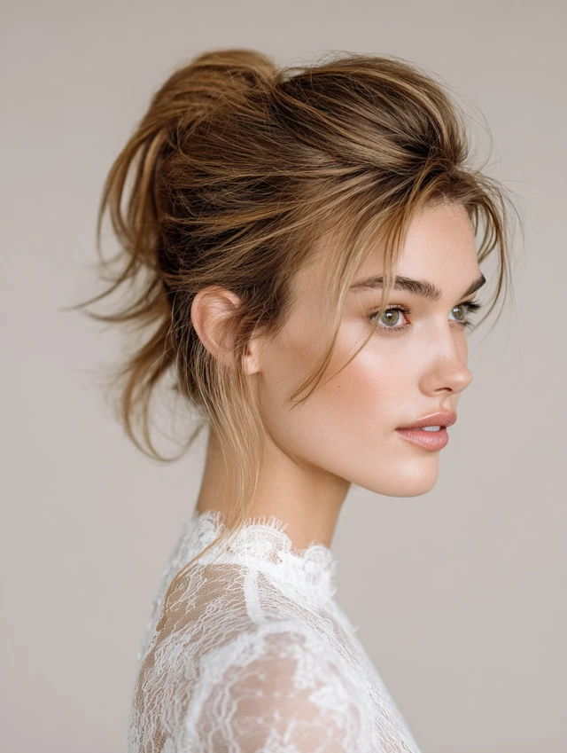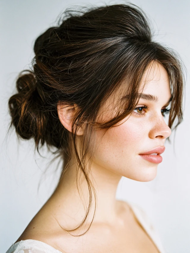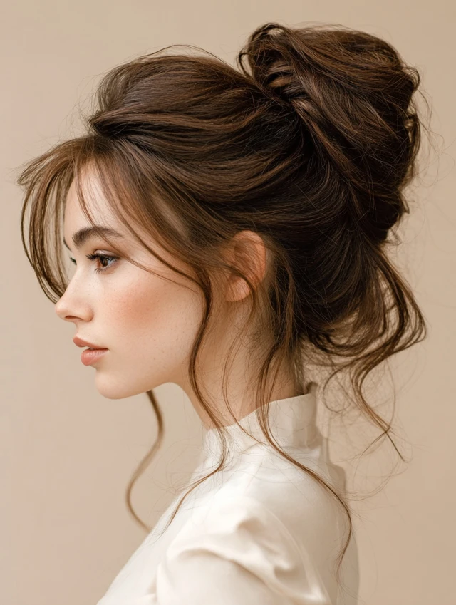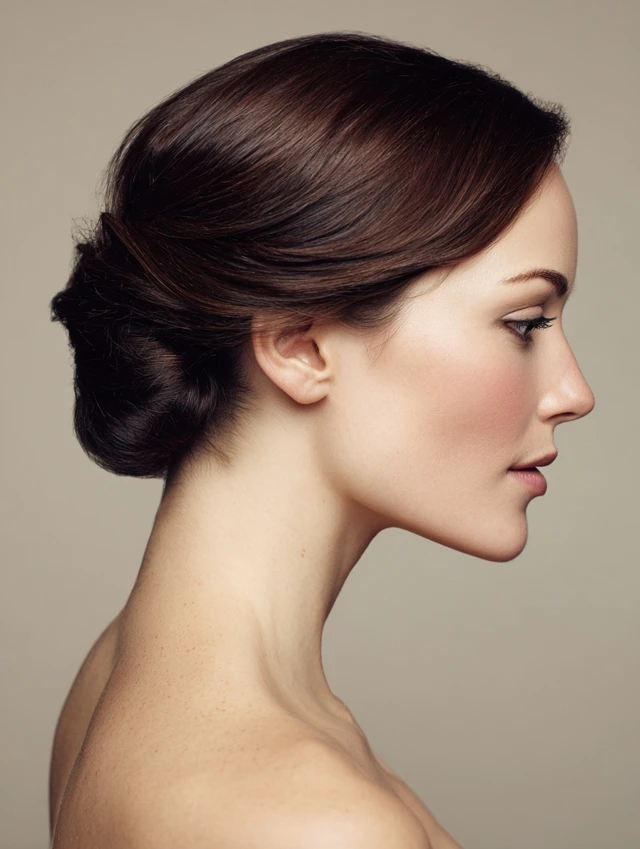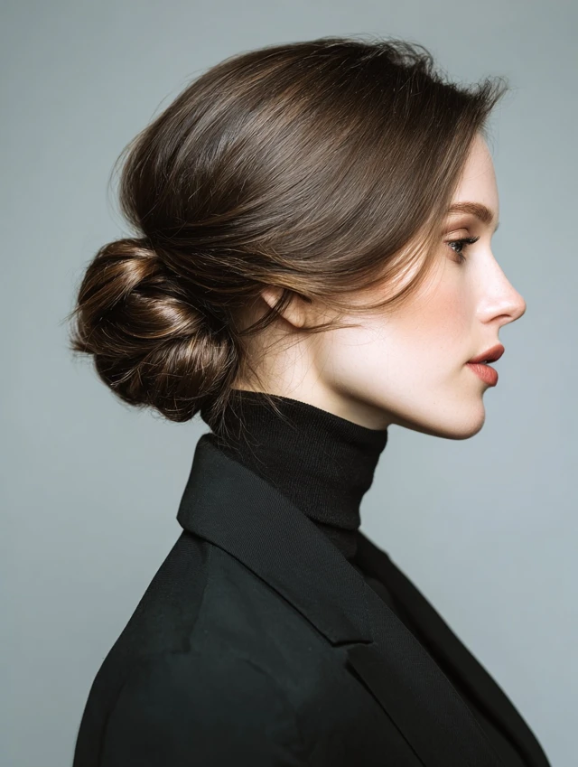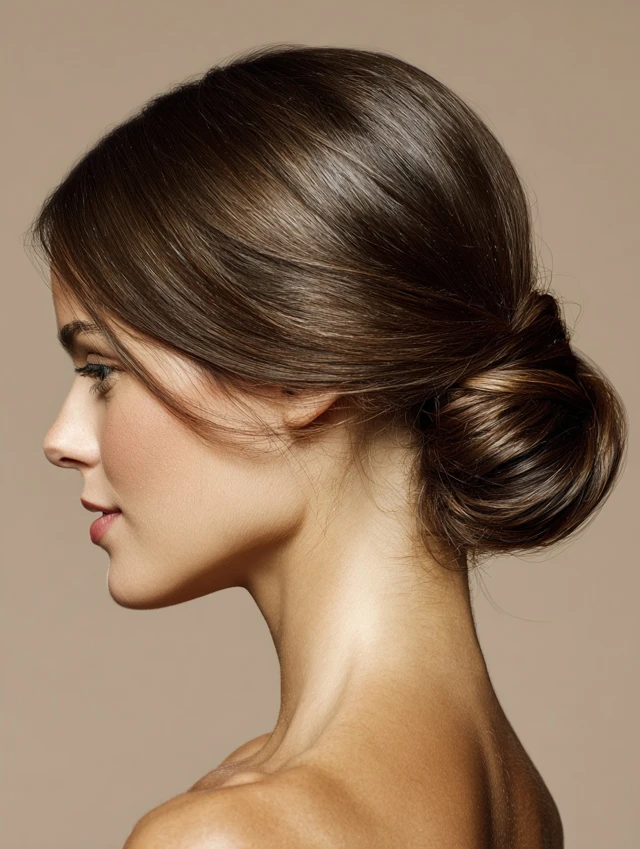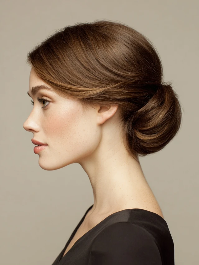 The classic chignon is elegant and structured, ideal for weddings or professional events. Hair is twisted and pinned at the nape, creating a timeless, sophisticated silhouette.