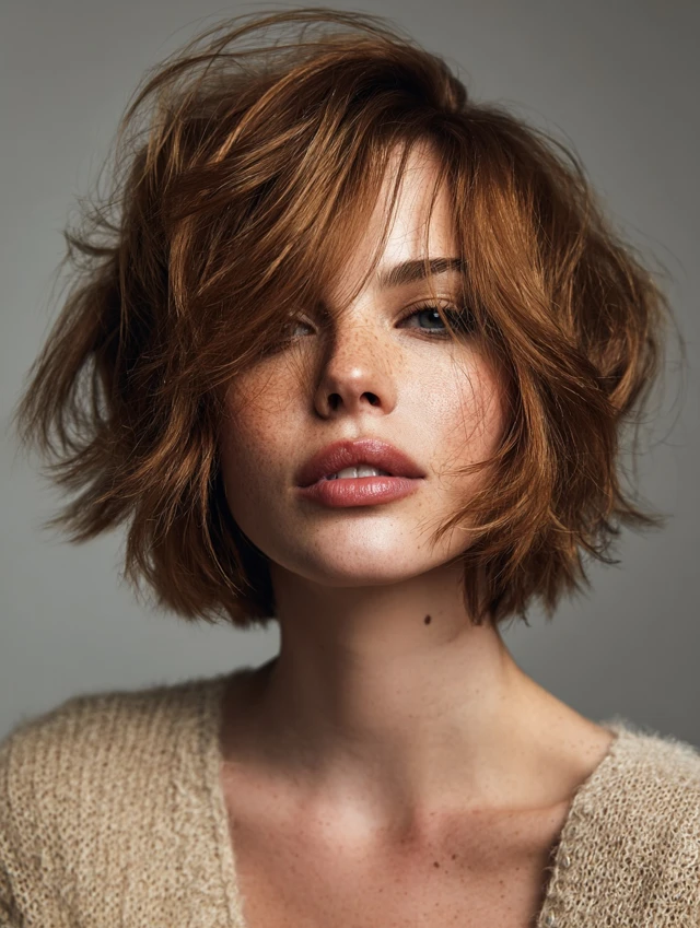 The tousled bob gives thick hair bounce and dimension. Layers throughout the cut prevent heaviness while maintaining volume at the crown. It suits oval and round faces, softening facial contours and adding a youthful feel.