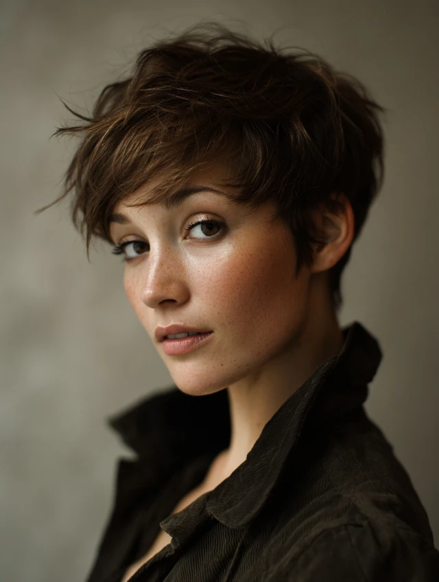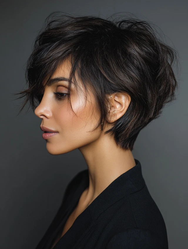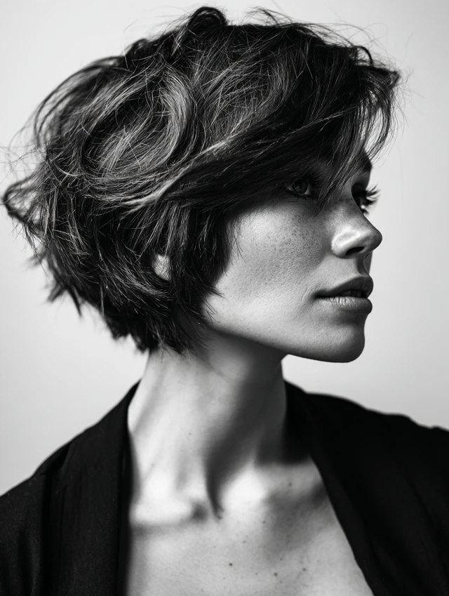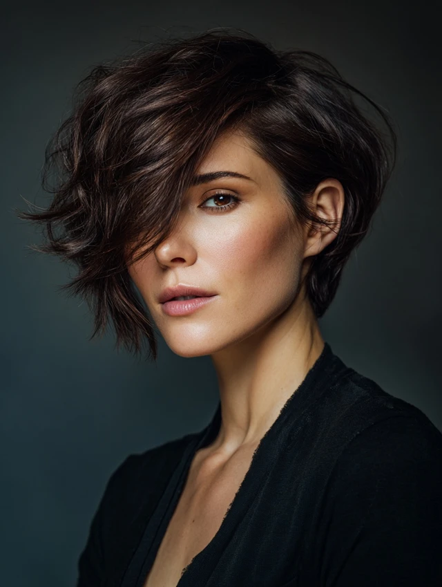 A textured side-swept short cut directs thick hair forward for volume and movement. Layers create a messy, lived-in appearance while framing the face. It suits heart-shaped and oval faces, softening features.
