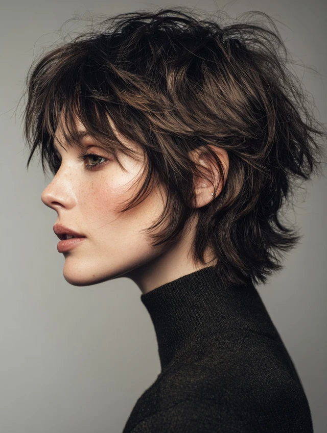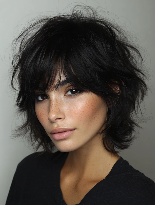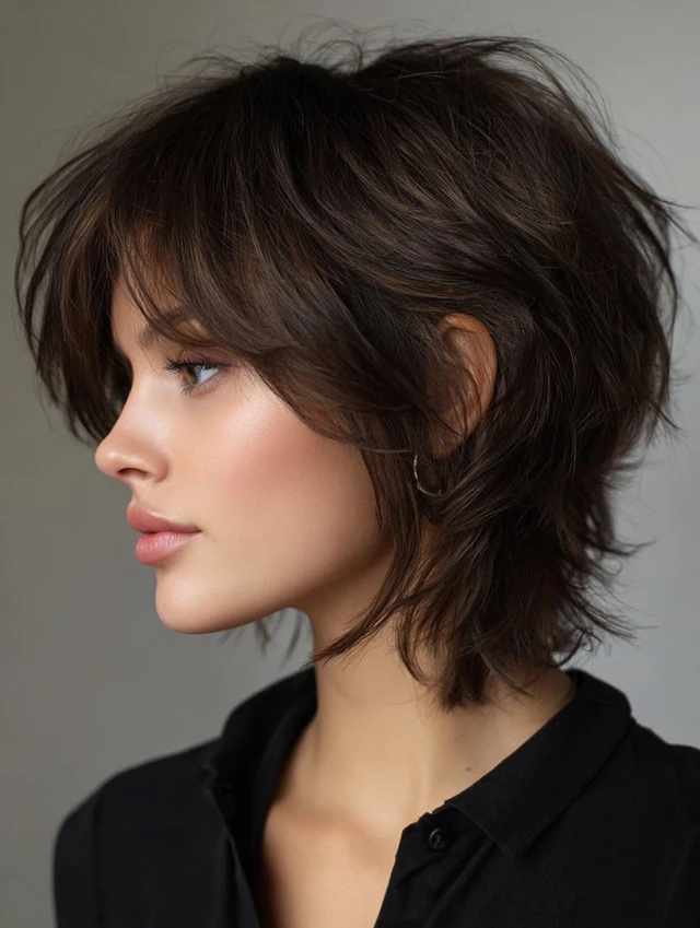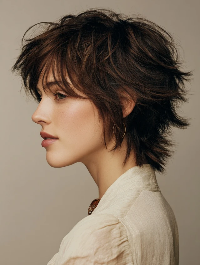 A short shag with feathered layers adds texture and movement, keeping thick hair from looking heavy. Layers around the crown and sides create lift, giving a casual, tousled style. This cut flatters oval, round, and square face shapes.