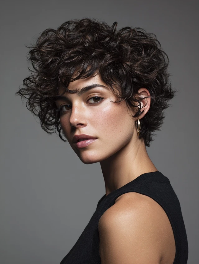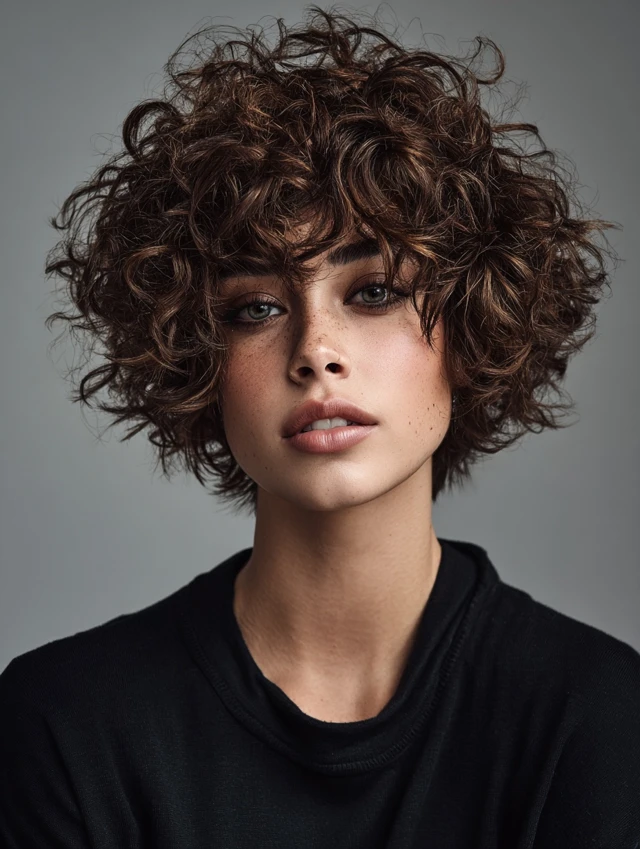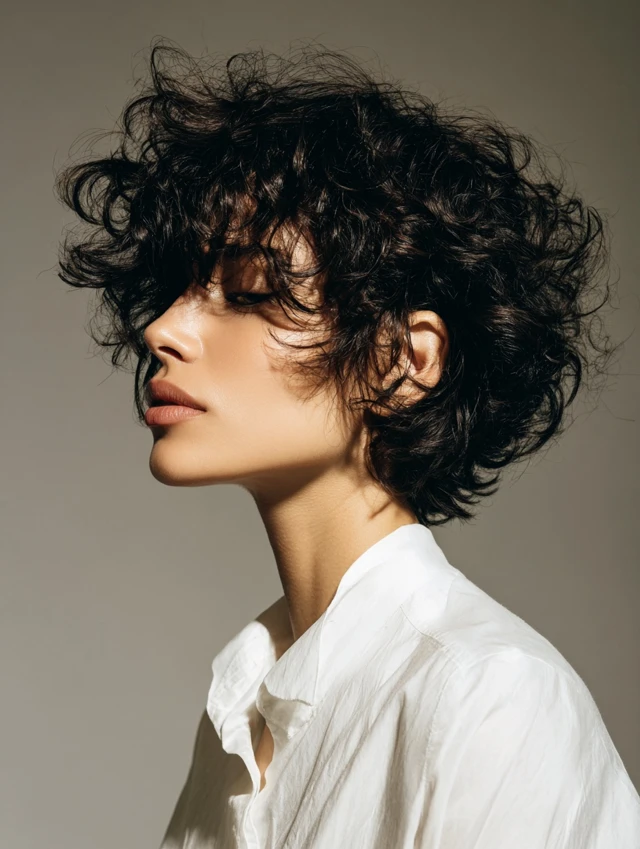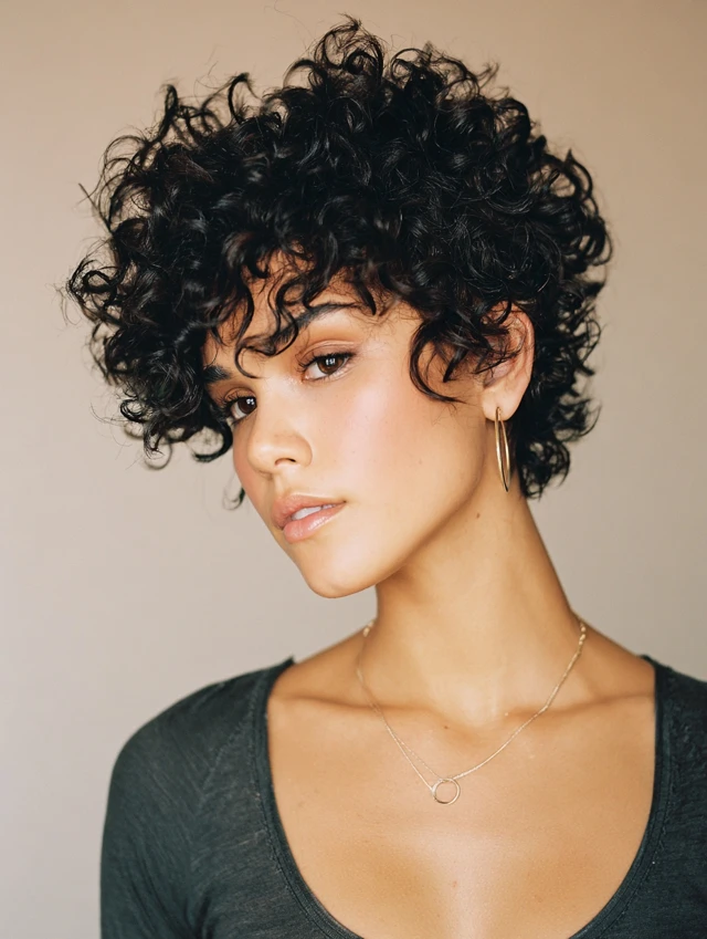 The messy curly crop embraces natural curls while keeping hair controlled. Layers reduce bulk and enhance shape, creating a fun, effortless vibe. It works well for round and oval faces, highlighting eyes and cheekbones.