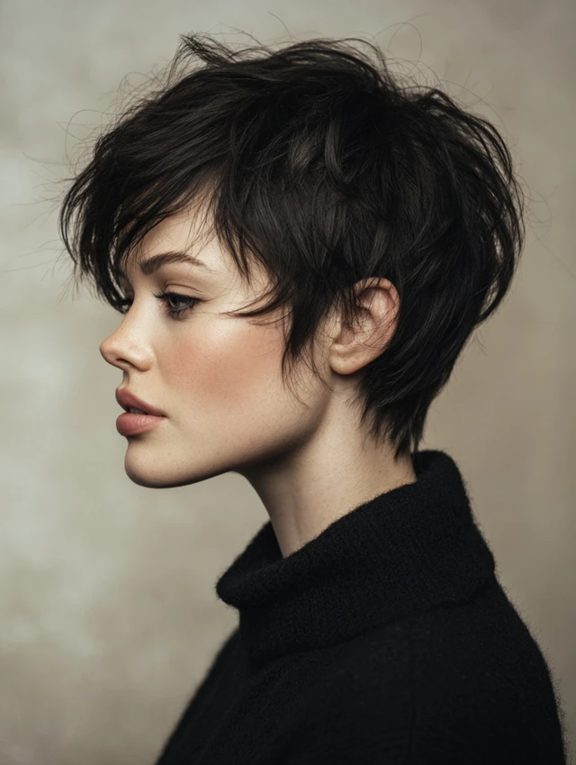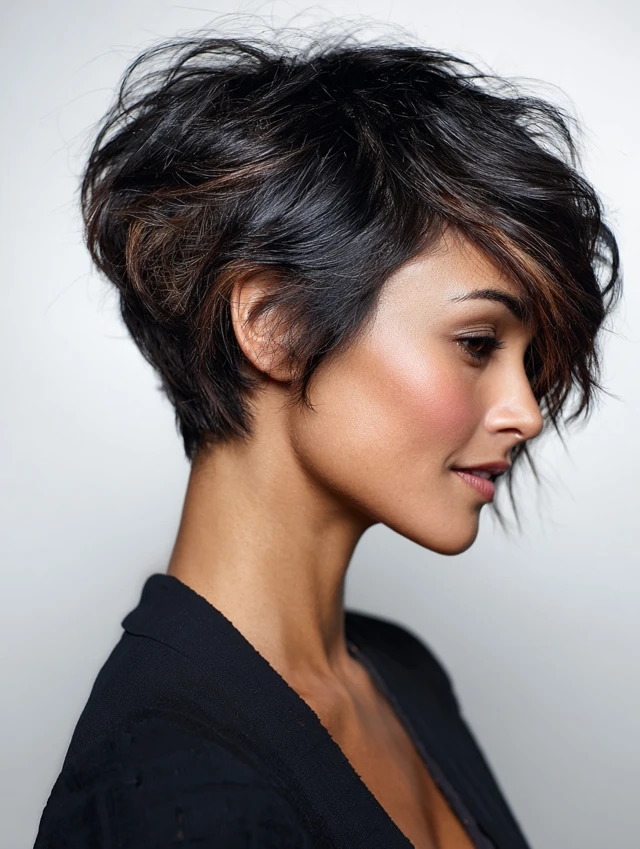 A layered choppy pixie reduces bulk while adding texture and movement. The layers create an edgy, playful look that works well with thick hair. This style suits oval, heart, and square faces, softening angles and highlighting features.