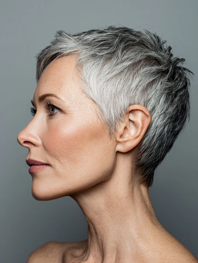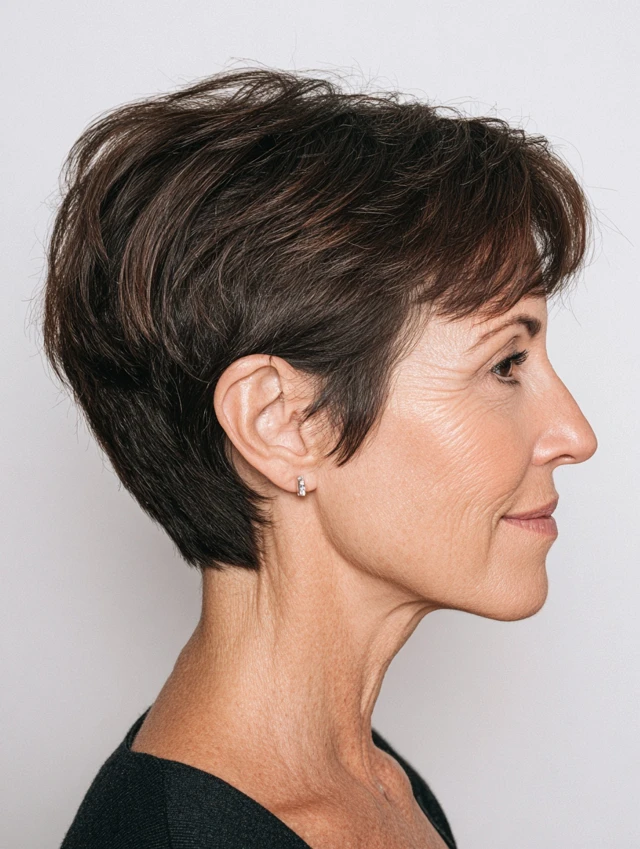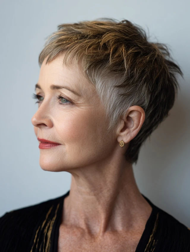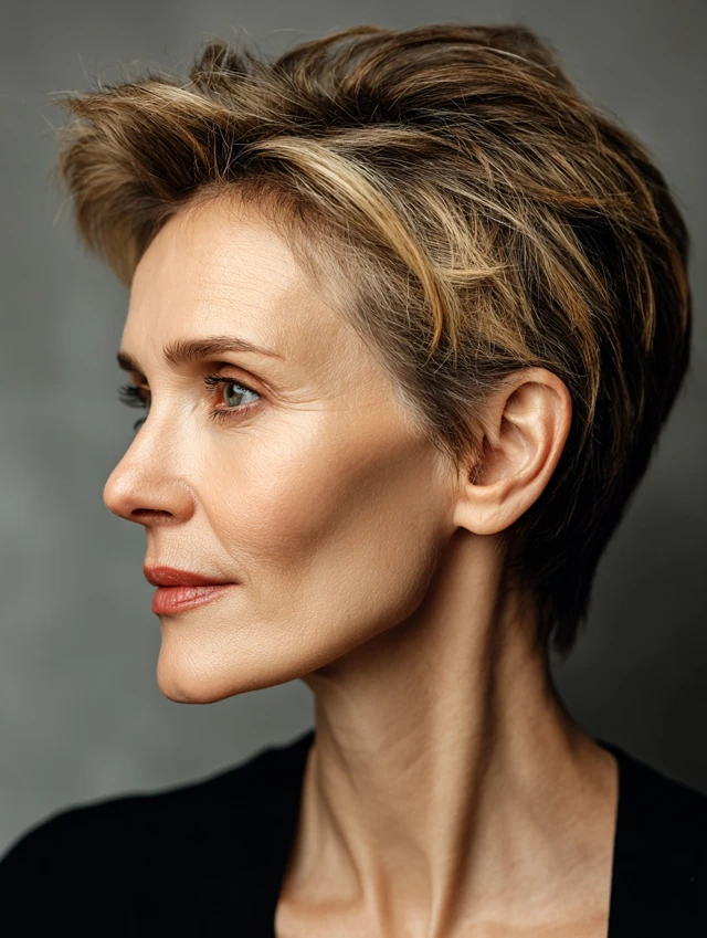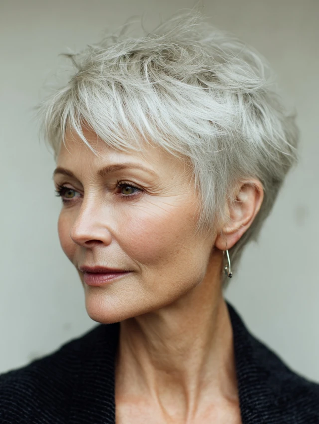 The feathered pixie creates texture and height in thin hair. Short layers at the crown lift the face while sides remain clean. It highlights cheekbones and eyes and suits round or oval face shapes. This style adds a youthful, confident look.