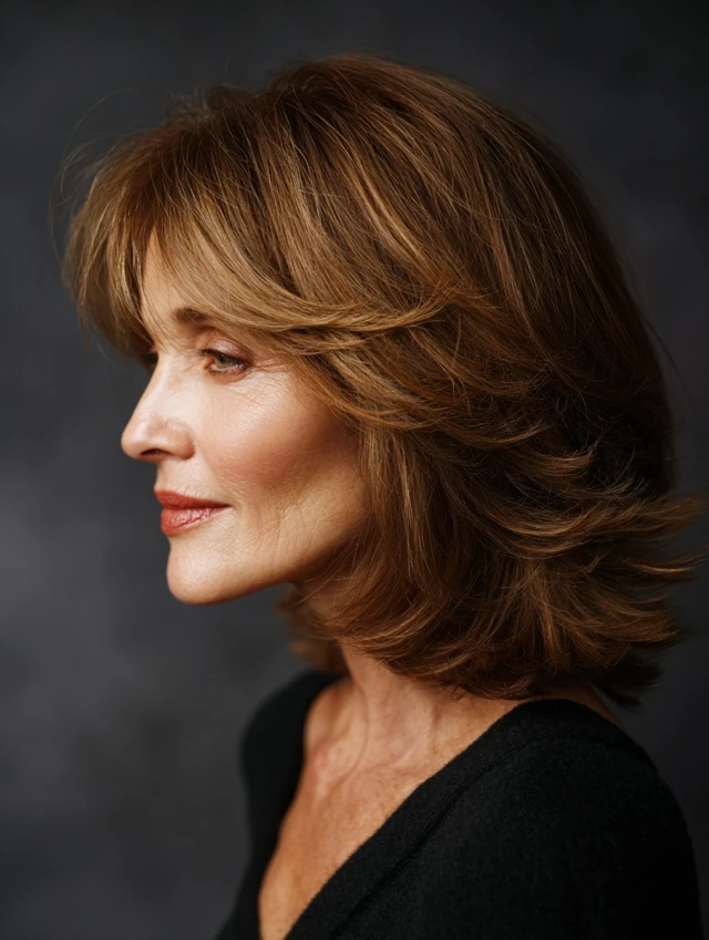 This shoulder-length cut offers length while preventing hair from looking flat. Face-framing layers soften features and guide attention upward. It balances longer face shapes and helps thin hair appear thicker. The overall effect is natural and sophisticated.
