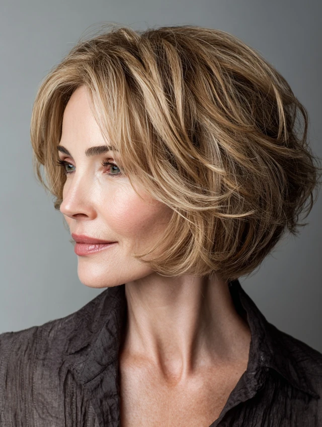 A soft layered bob adds movement where thin hair needs it most. Light layers prevent ends from looking stringy while creating natural lift. Lengths from the chin to shoulders balance facial proportions. This style suits oval, heart, and square face shapes, softening angles and highlighting facial features.
