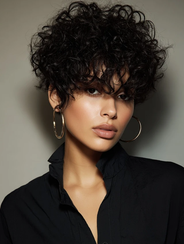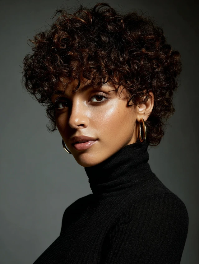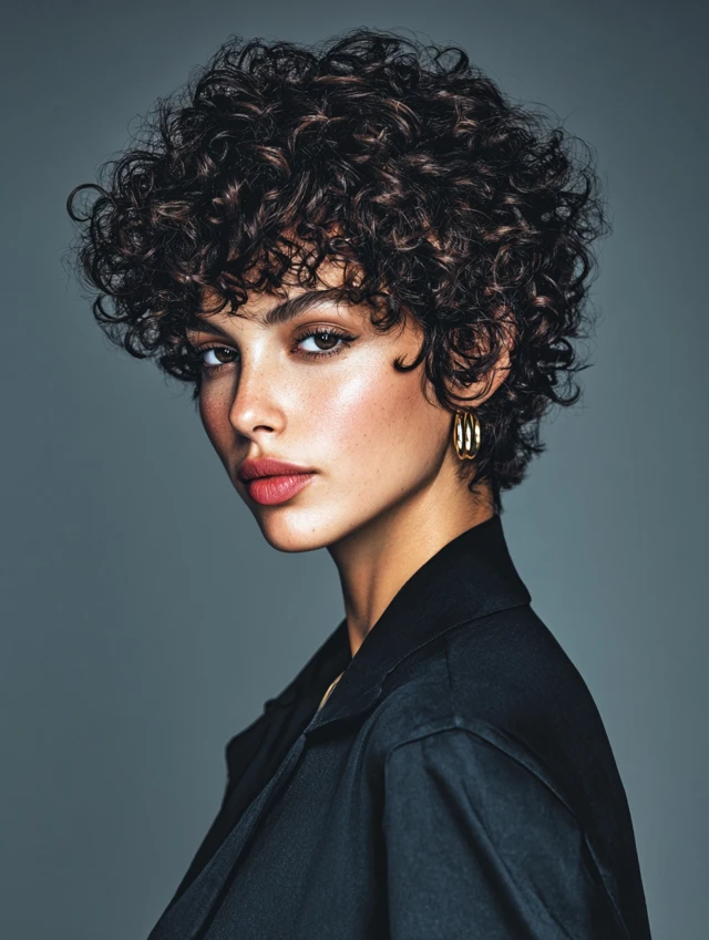 A short curly crop embraces natural curls while remaining tidy. Layers control bulk and enhance shape, giving hair a defined yet effortless look. Round, oval, and heart-shaped faces benefit from this cut.
