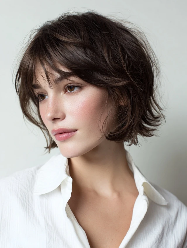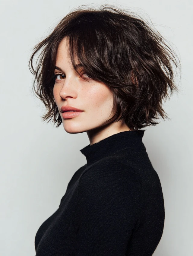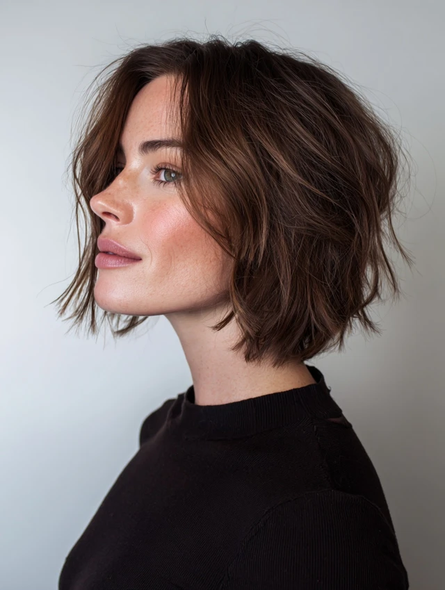 A textured bob adds movement while keeping length manageable. Layers prevent heaviness and create a playful, effortless appearance. This cut suits oval and round faces, softening angles and adding balance.