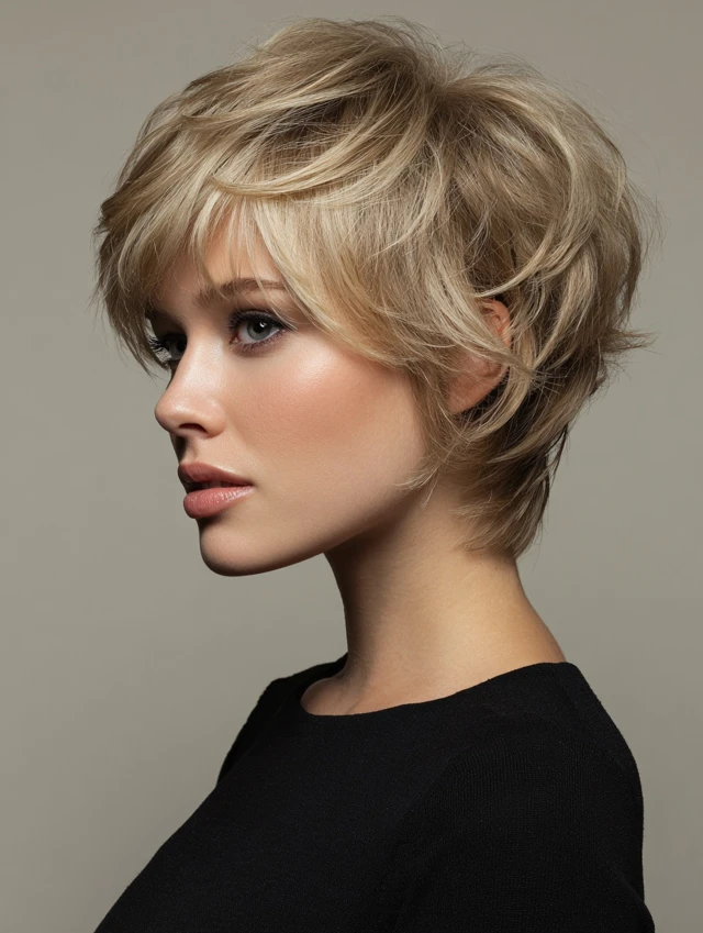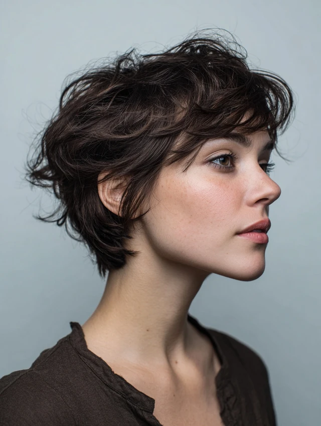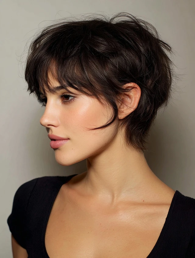 A messy pixie with side bangs softens facial features while giving a playful edge. The layers add volume and texture, keeping the style light. Oval, heart, and square faces benefit most from this cut.