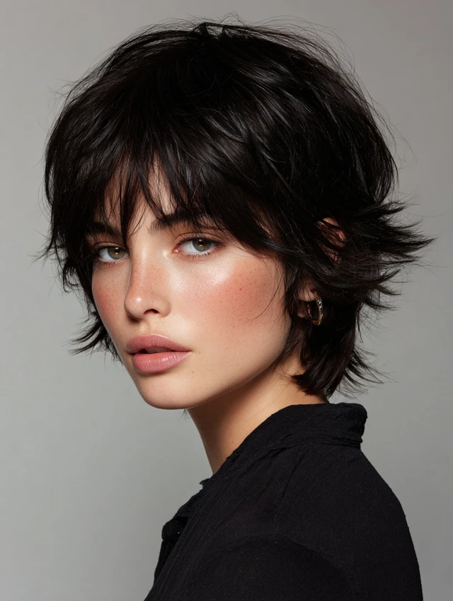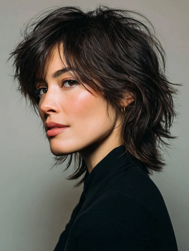 A short layered shag reduces bulk and adds dimension to hair. Layers around the crown and sides create natural volume and movement. This style suits oval, round, and square faces, balancing facial features.