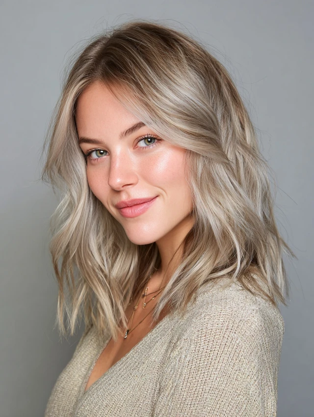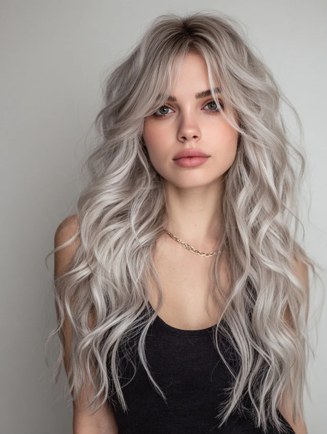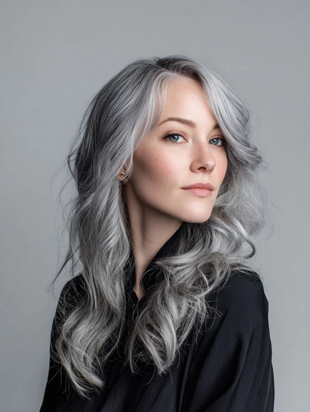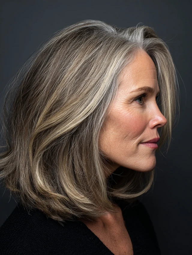 It suits oval, round, and square face shapes and works on straight to wavy hair. Best for medium to long lengths. Maintenance is moderate, with toning treatments keeping silver bright. Ideal for women who want a polished but low-contrast look.