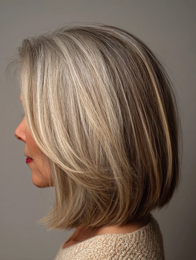 Ash blonde highlights soften darker gray areas while adding brightness. The cool tones blend smoothly with natural silver, creating a refined, balanced finish. This style prevents gray hair from appearing flat or yellow.