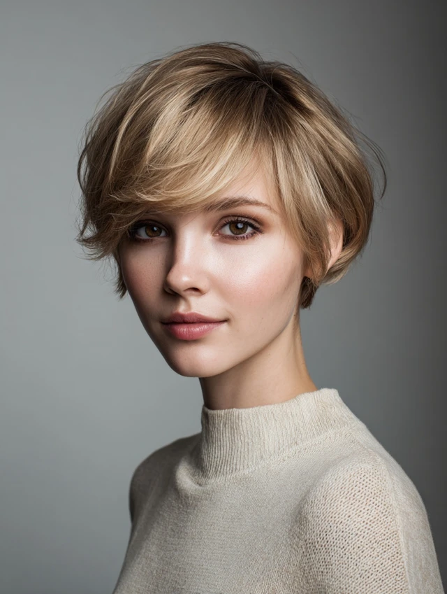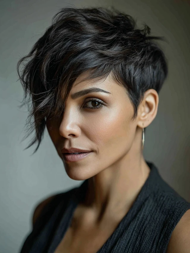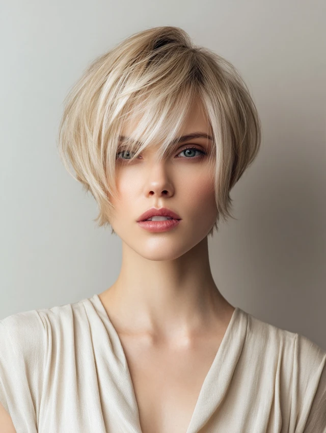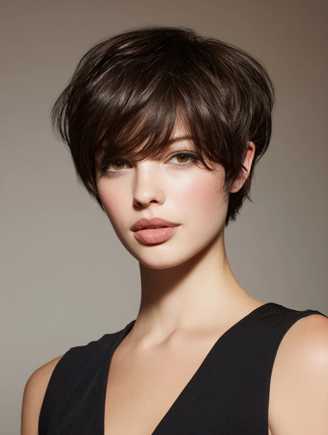 Side-swept layers draw attention to the eyes and cheekbones while creating a flattering diagonal line across the face. The style adds texture and motion to short hair.