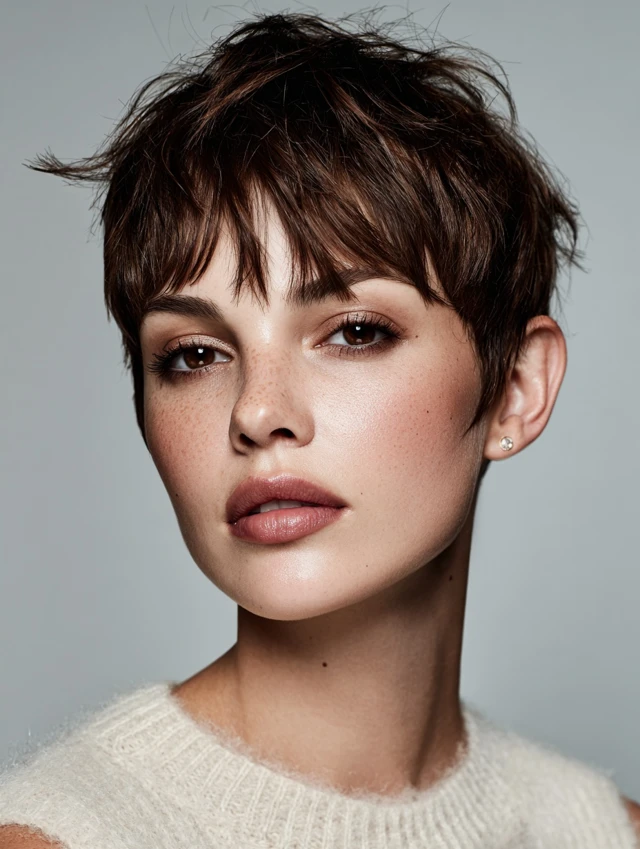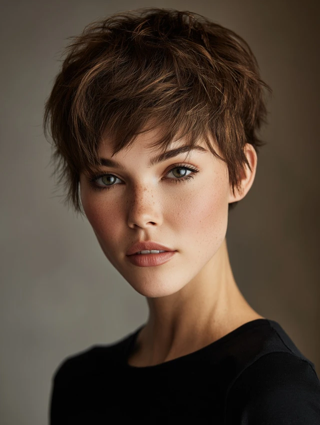 This cut uses short layers with bangs that softly frame the eyes and cheekbones. The layers add texture and volume, making the haircut dynamic and youthful.
