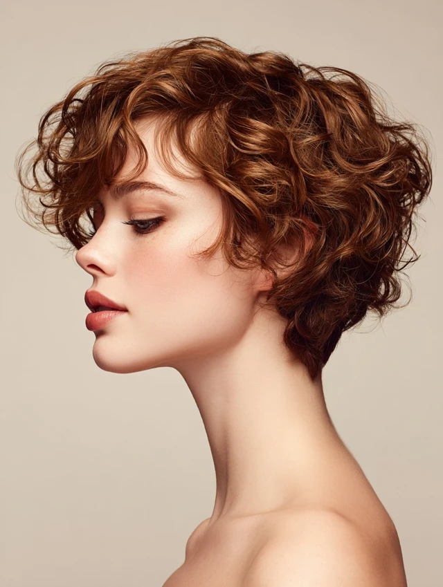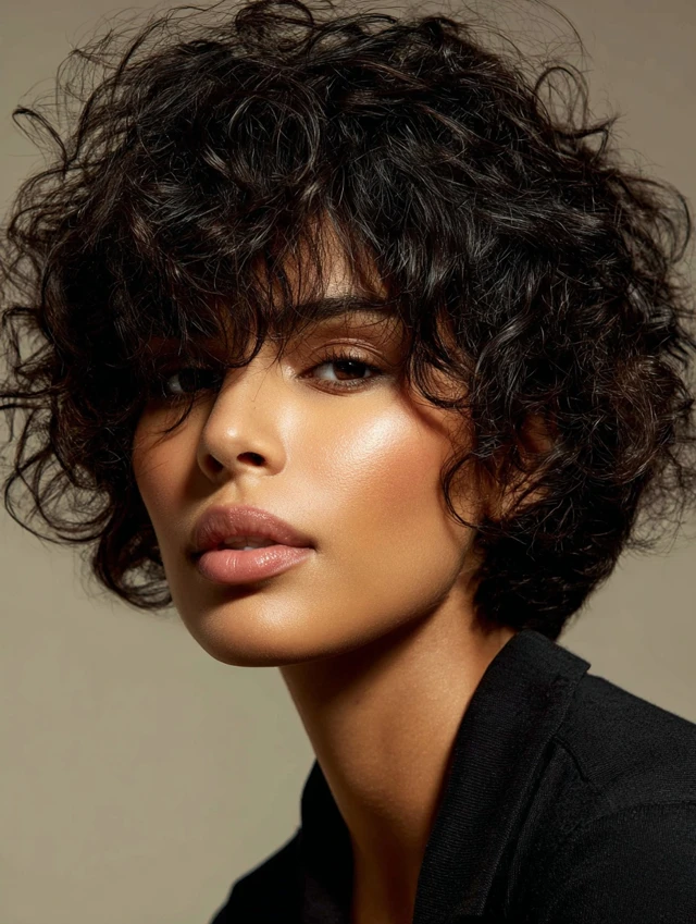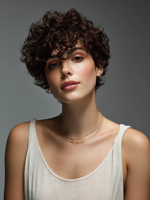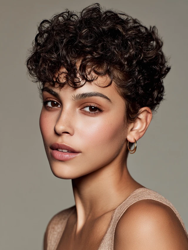 A curly crop with face-framing layers softens features and distributes volume evenly. The curls create a playful, lively appearance while highlighting facial structure.