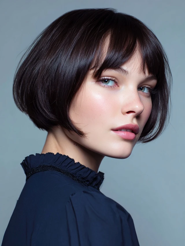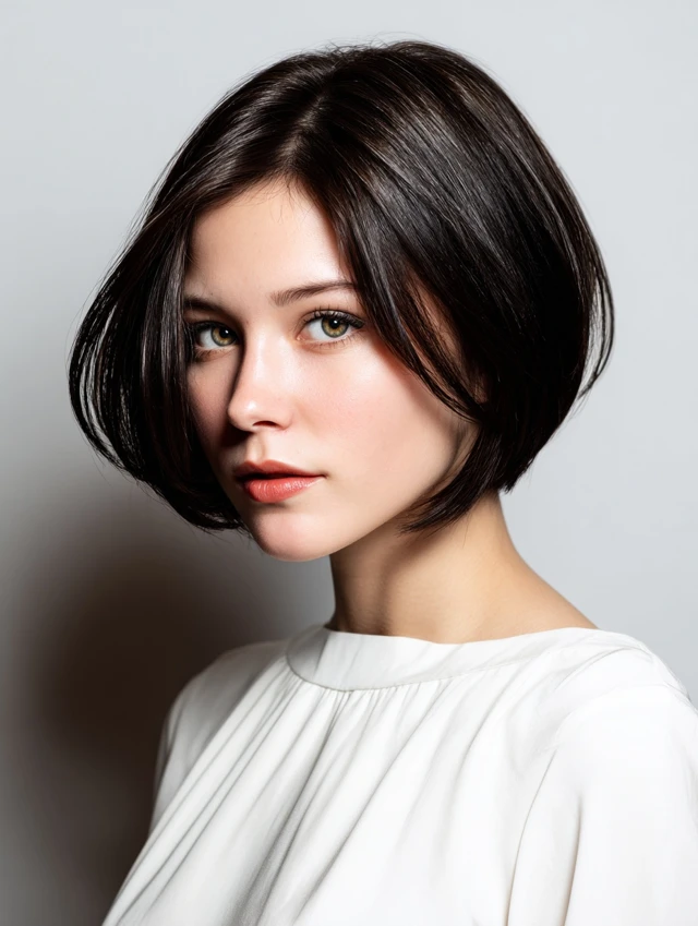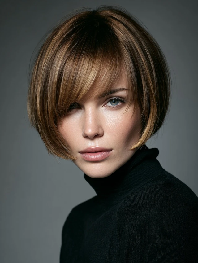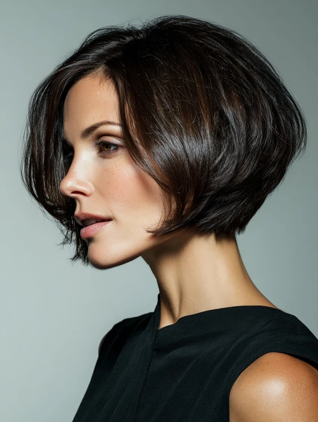 A short bob with front layers softens jawlines and highlights facial features. The angled layers in front create a gentle frame, enhancing the face without overwhelming it.