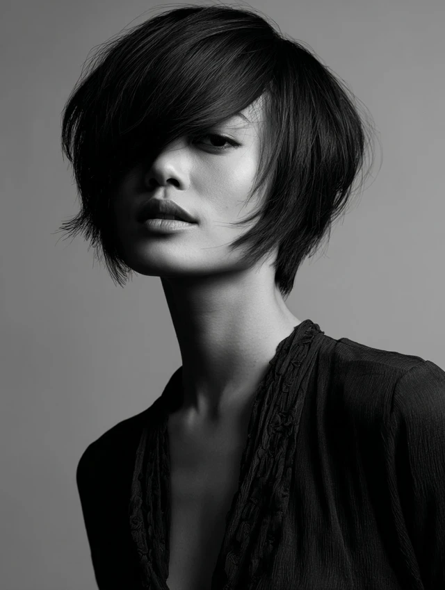 An asymmetrical short cut with long front layers draws attention to the eyes and cheekbones. The shape adds modernity and edge while softening the jawline.