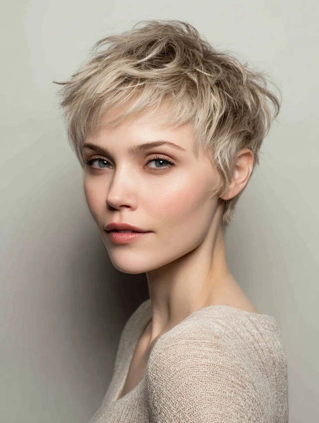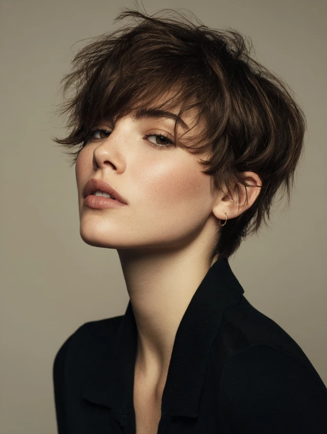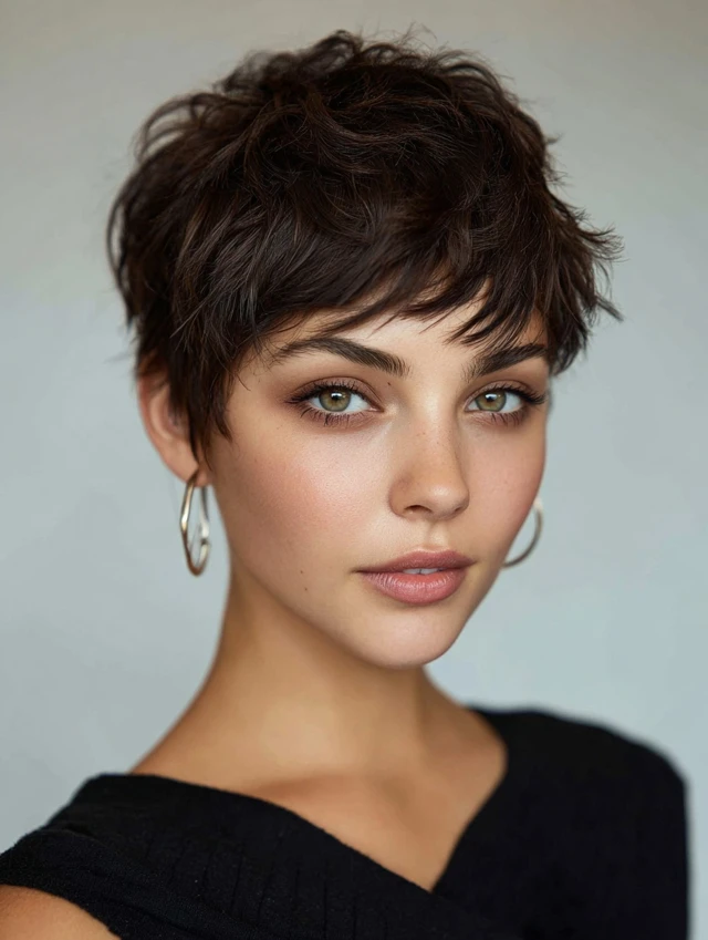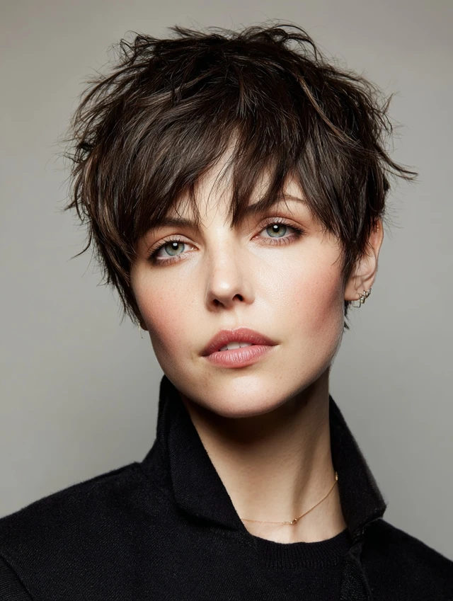 A textured pixie with side bangs creates movement and volume, highlighting the eyes and cheekbones. Choppy layers add a modern edge.