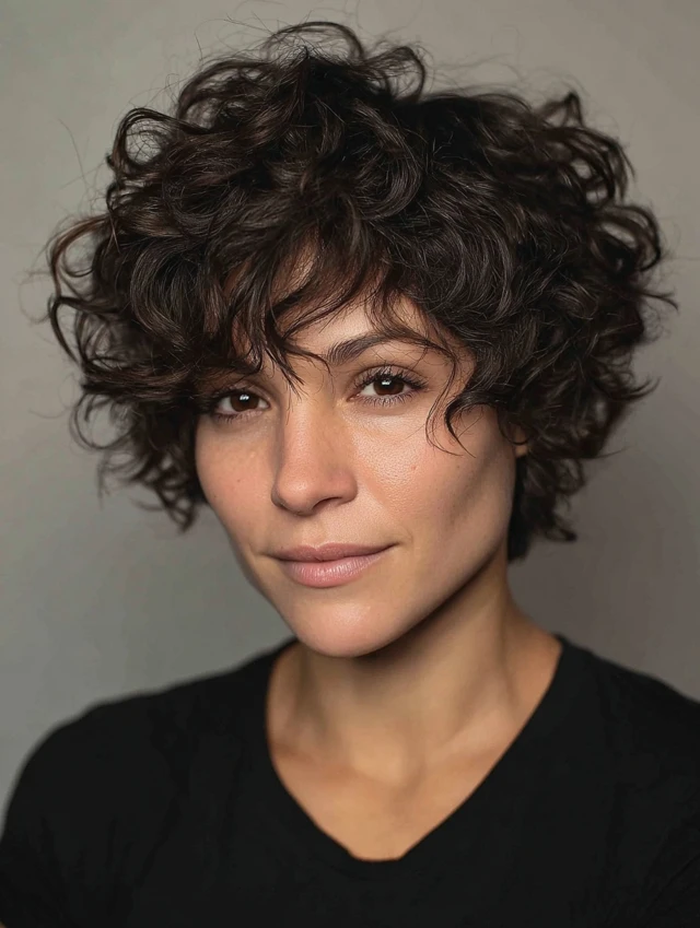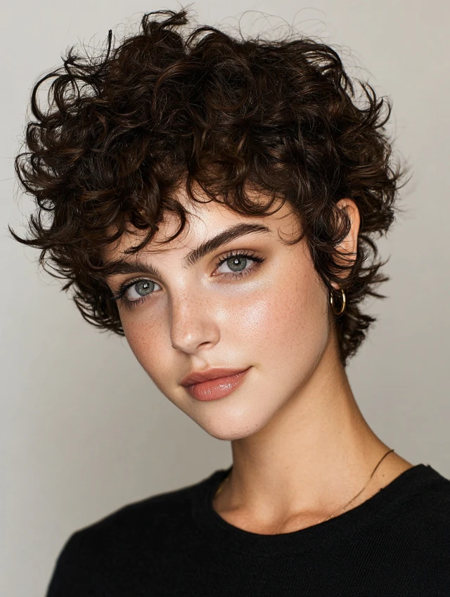 A curly short pixie shag enhances natural curls with layered texture. It adds volume, bounce, and a youthful, edgy appearance.