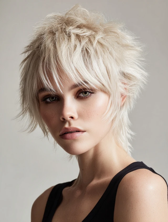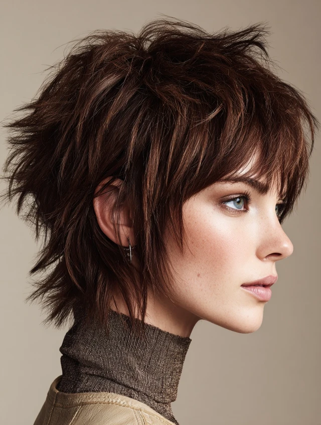 A spiky short shag features choppy, layered ends styled upwards or outward. This cut adds personality and texture for a playful, edgy look.