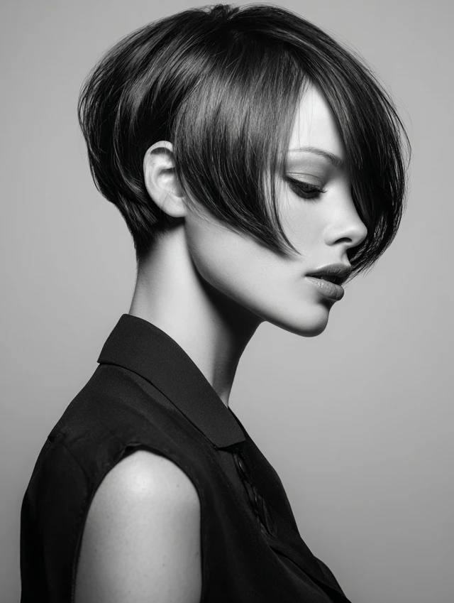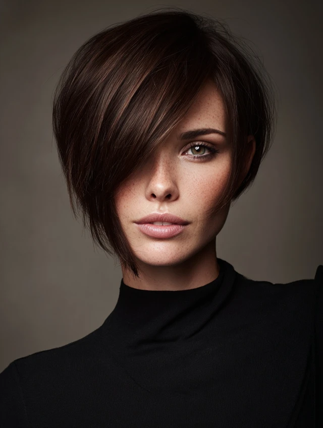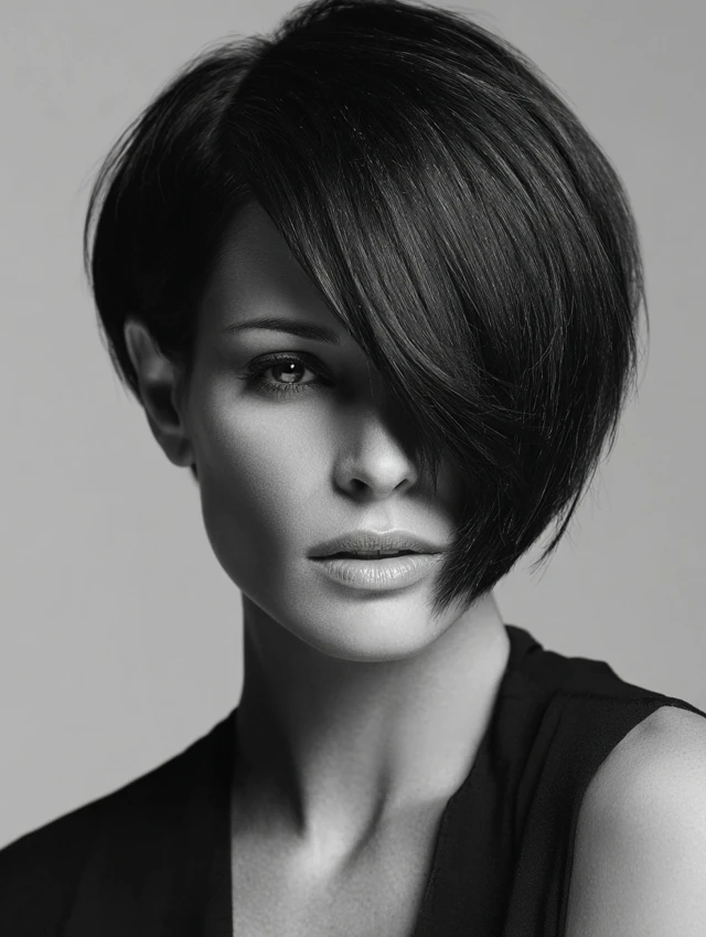 An asymmetrical short bob features longer pieces on one side, creating a striking, contemporary look. Angles highlight facial features while adding sophistication.