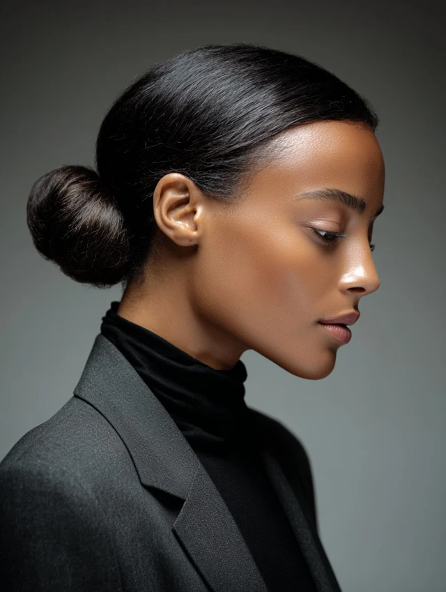 It suits medium to long hair of all curl patterns. Styling is simple: smooth hair with gel or edge control, gather into a bun at the nape. This style is low-maintenance, comfortable for long hours, and ideal for meetings or office events.