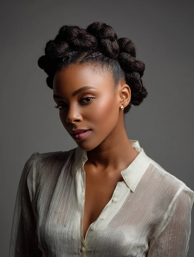 Flat-twist updos create a neat, structured appearance while protecting natural hair. Twists can be styled into a bun or pinned back, keeping hair off the face. This look complements all face shapes and adds elegance without effort.