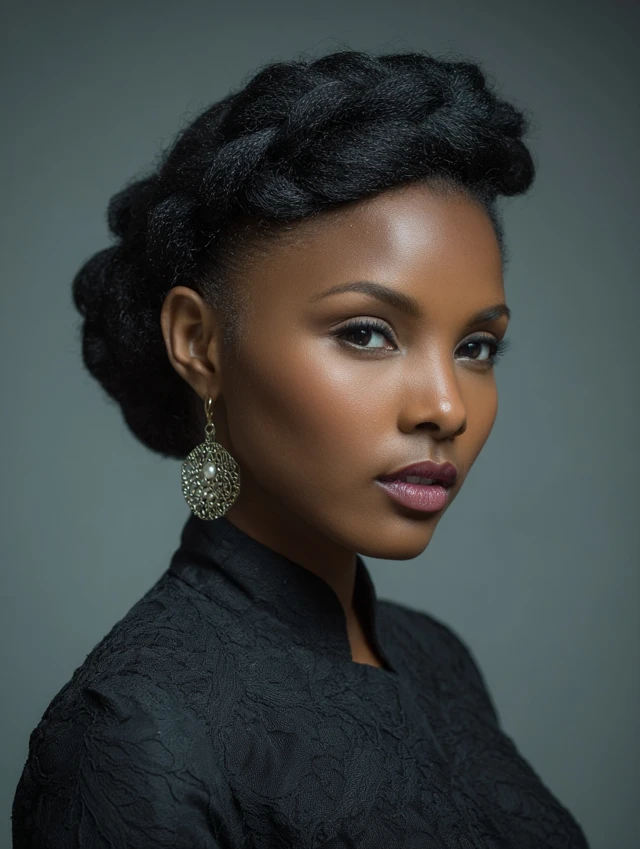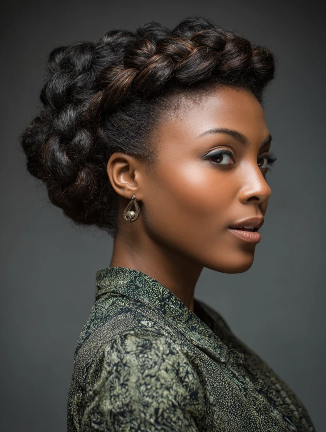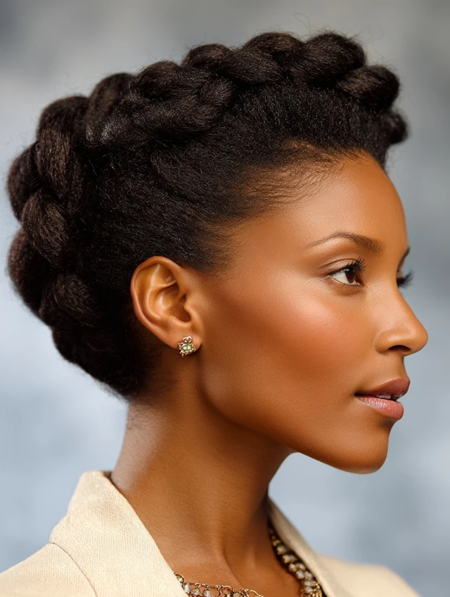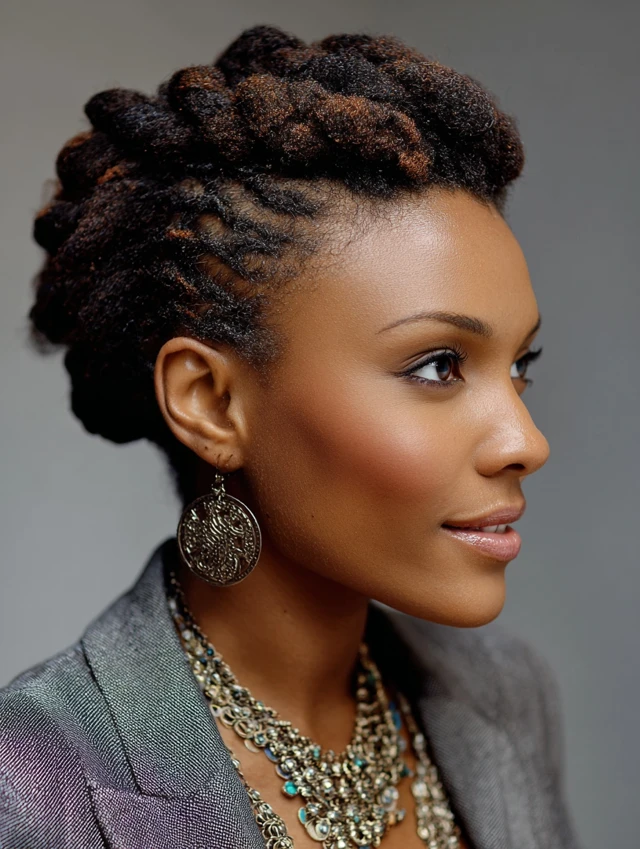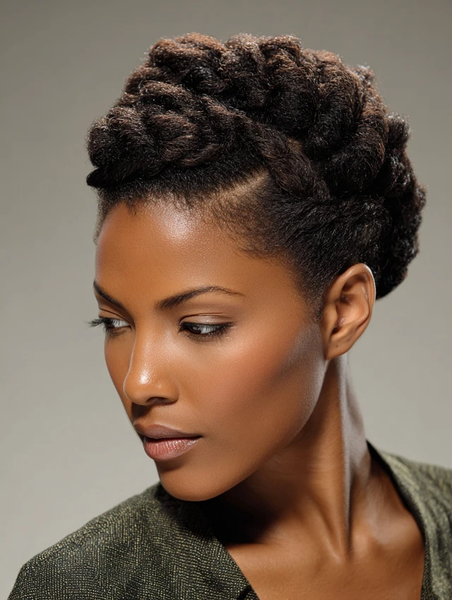 It works on short to medium natural hair. A styling gel or cream keeps twists defined, and bobby pins secure the updo. The style is long-lasting, easy to maintain, and ideal for formal office events or daily professional wear.