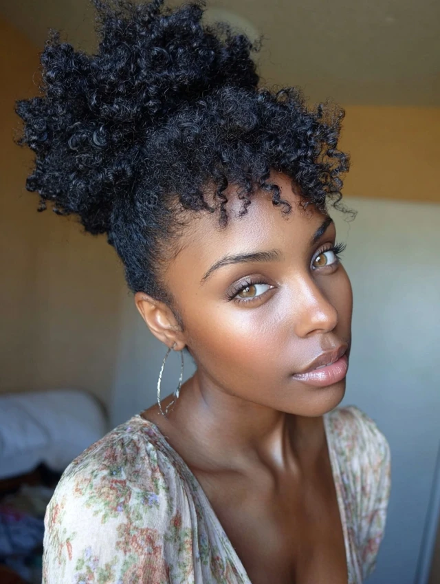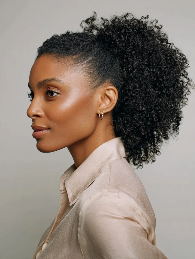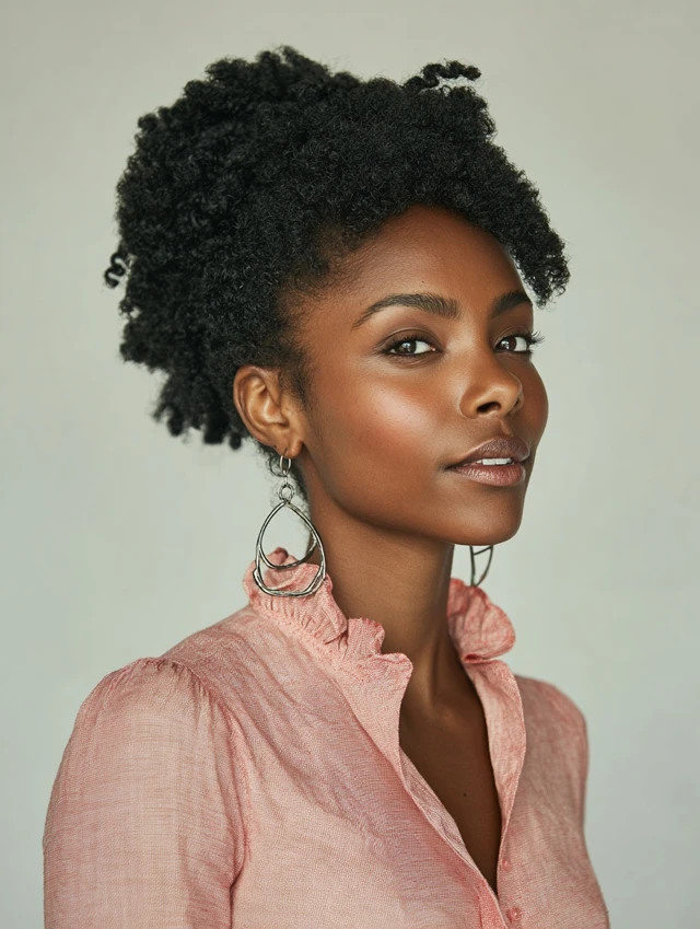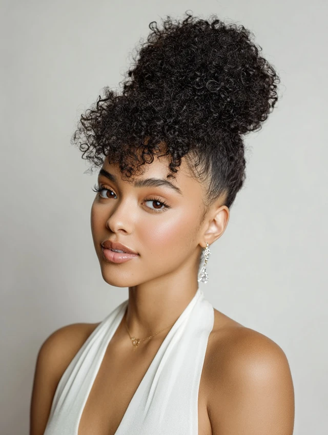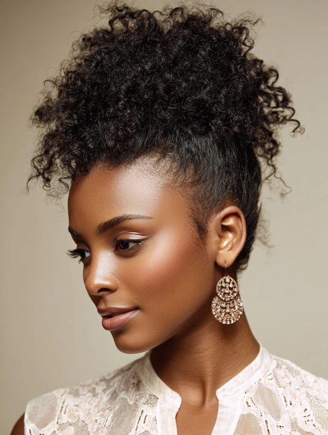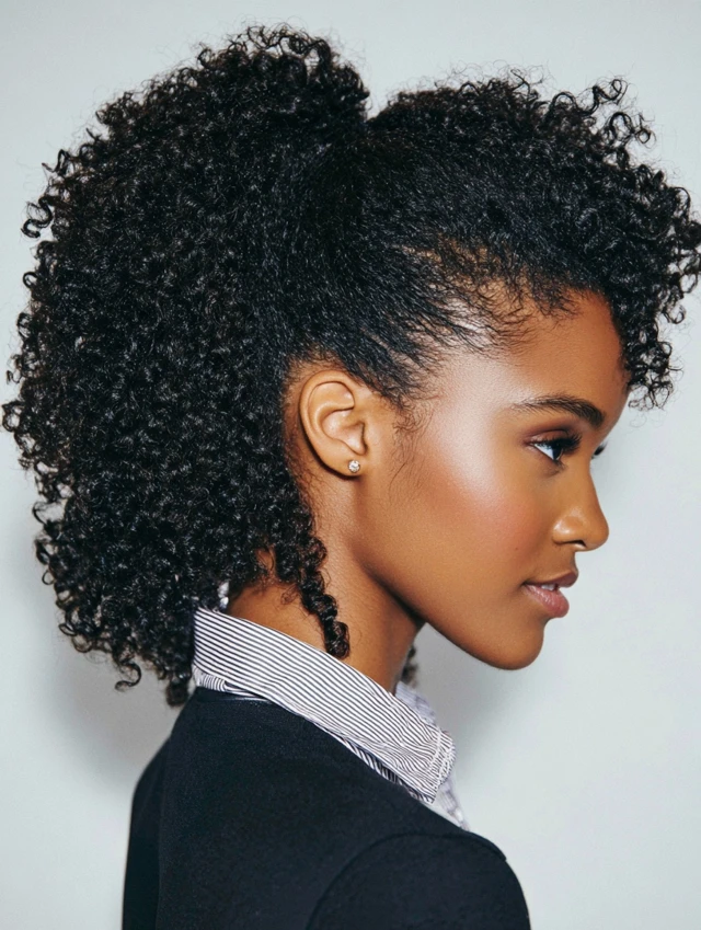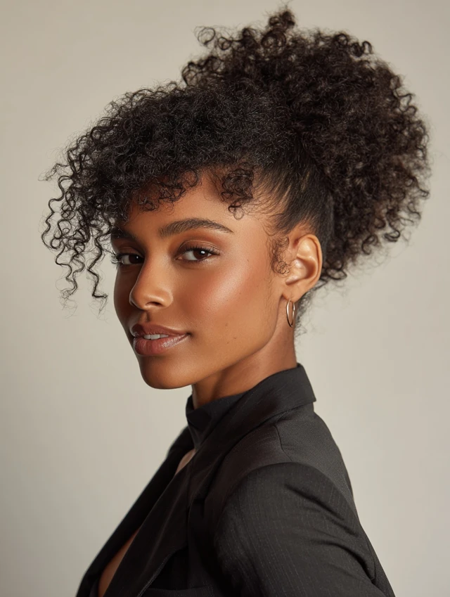 The high puff highlights natural curls while keeping hair tidy and professional. Volume at the top draws attention upward, balancing facial features. This style suits oval, heart, and round face shapes.