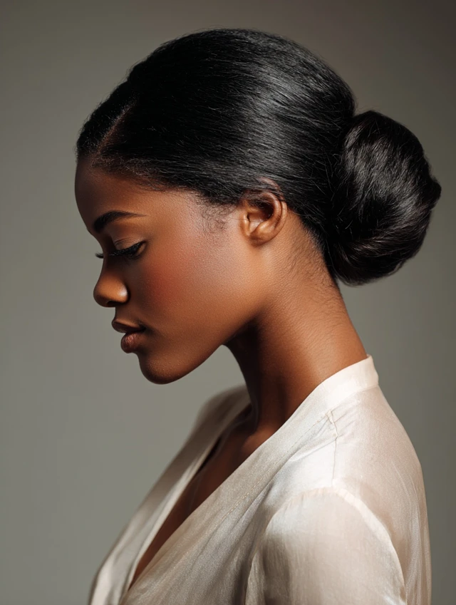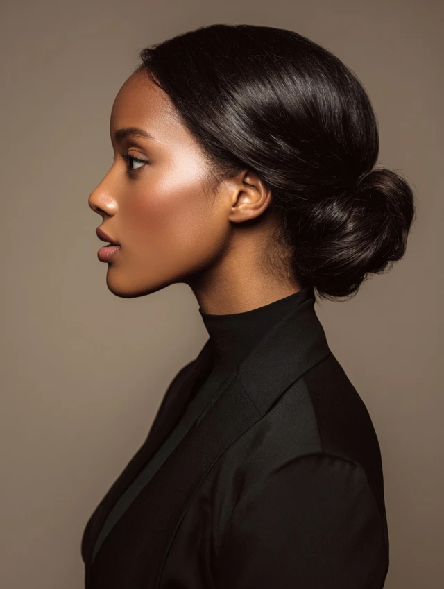 A low bun keeps natural hair sleek and controlled, perfect for professional settings. Defined edges frame the face and add a polished touch. This style works well for oval, heart, and square face shapes and keeps hair protected from daily wear.