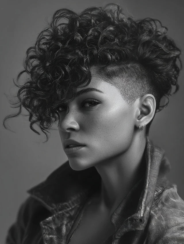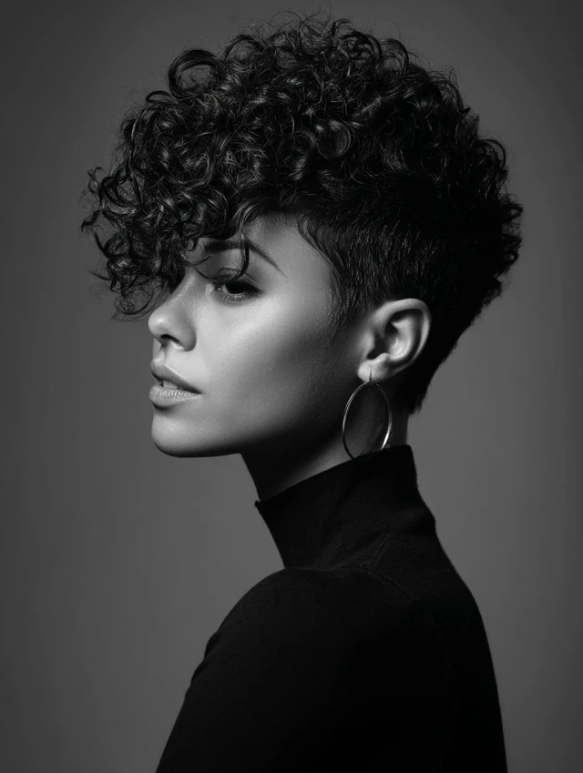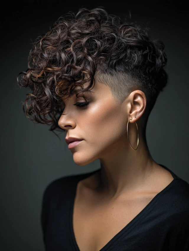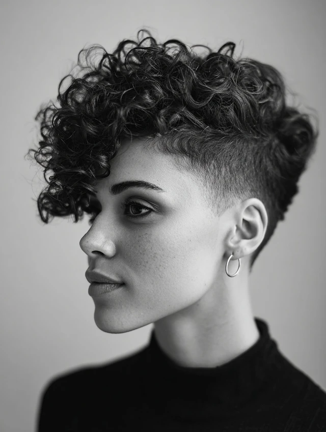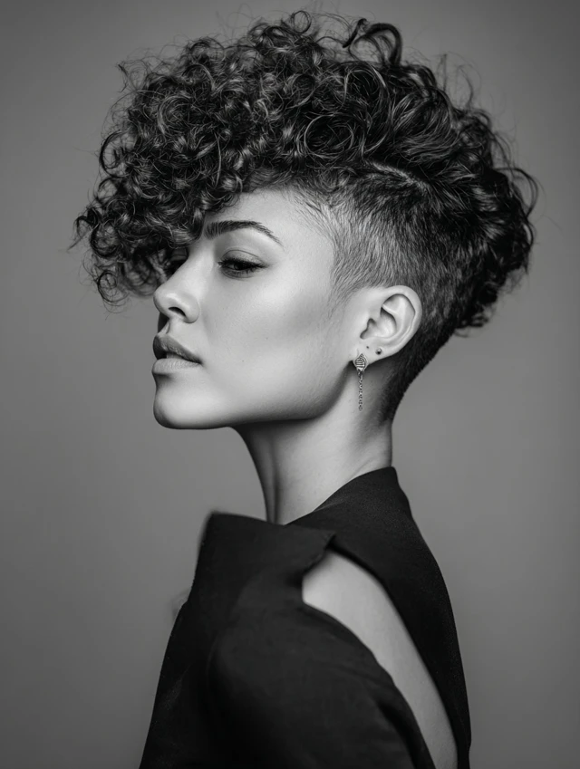 This cut features shaved or very short sides with curly volume on top. Suits oval, square, and heart-shaped faces. Thick or dense curls work best.