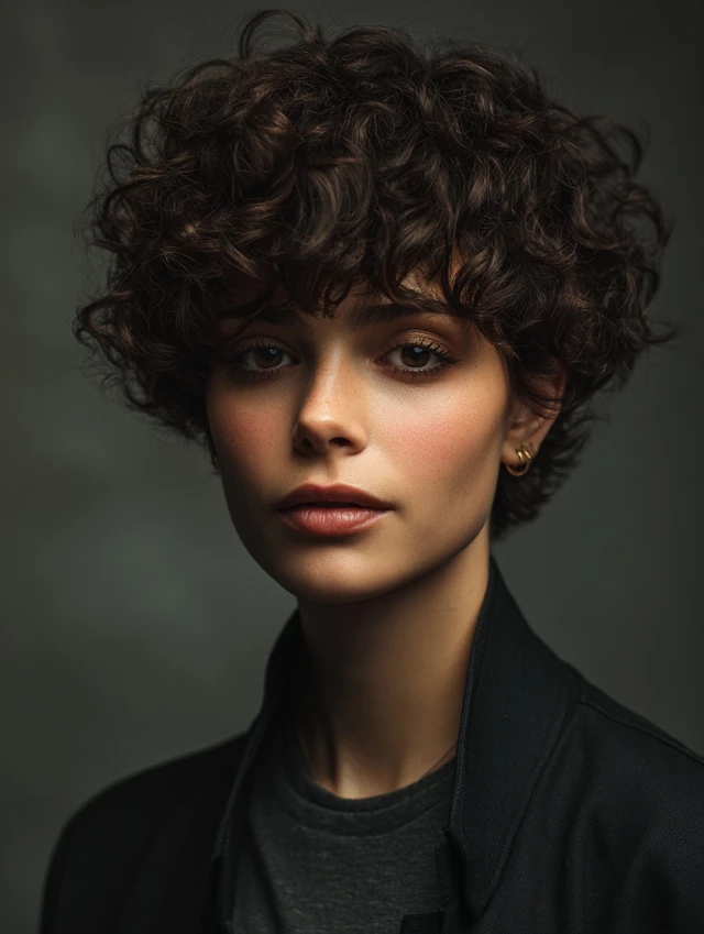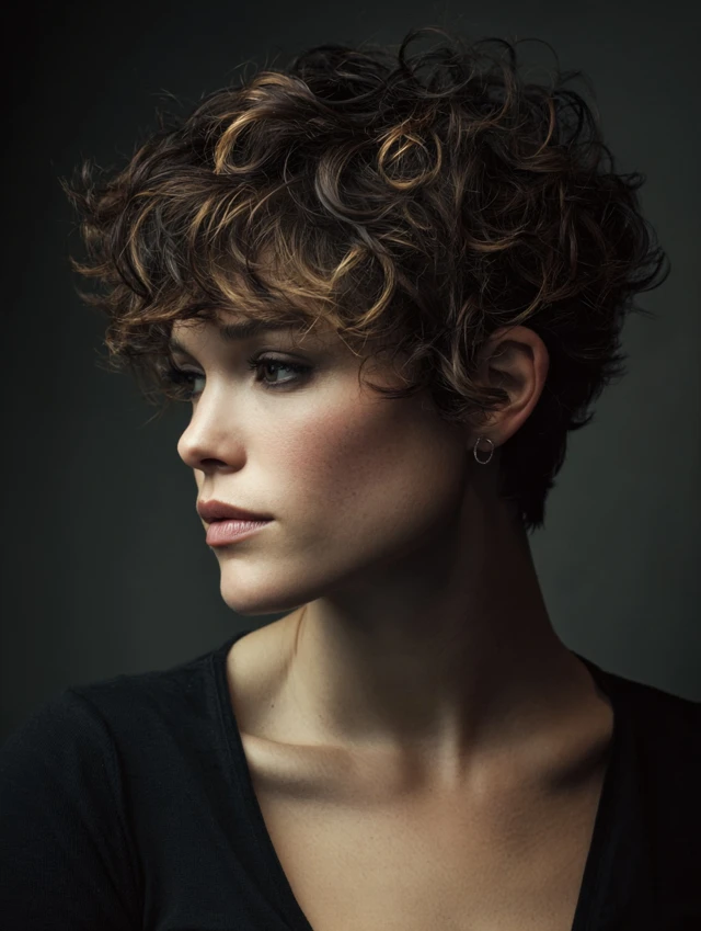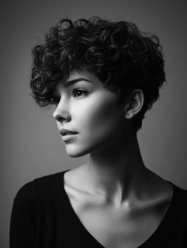 The classic curly pixie keeps curls short on the sides and slightly longer on top for volume. Works well for oval, heart-shaped, and square faces. Tight or loose curls gain a structured, bouncy look.