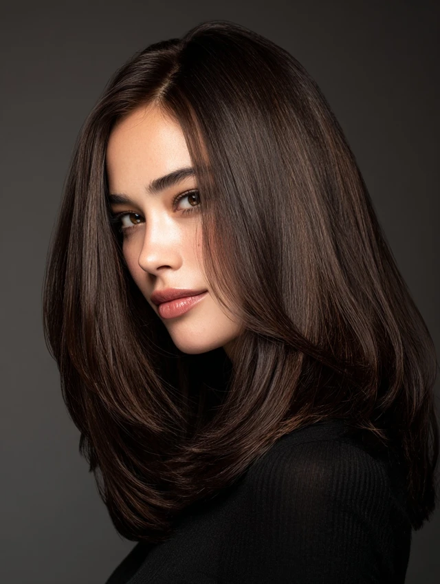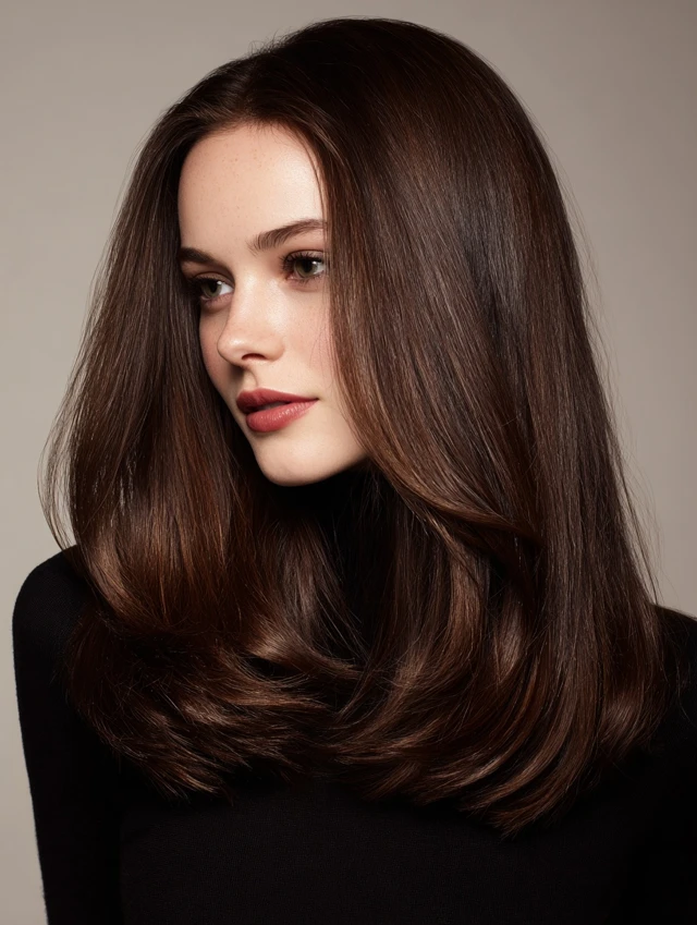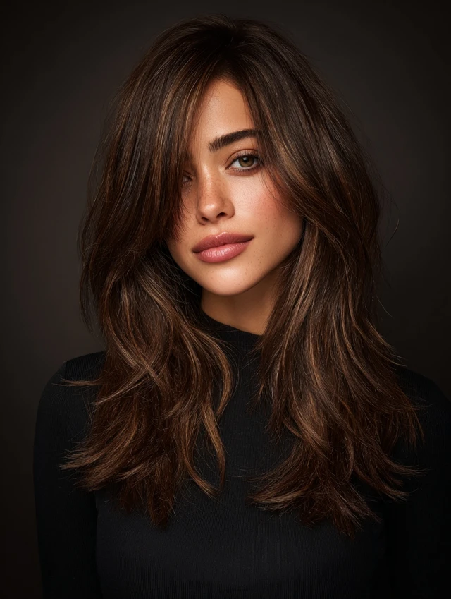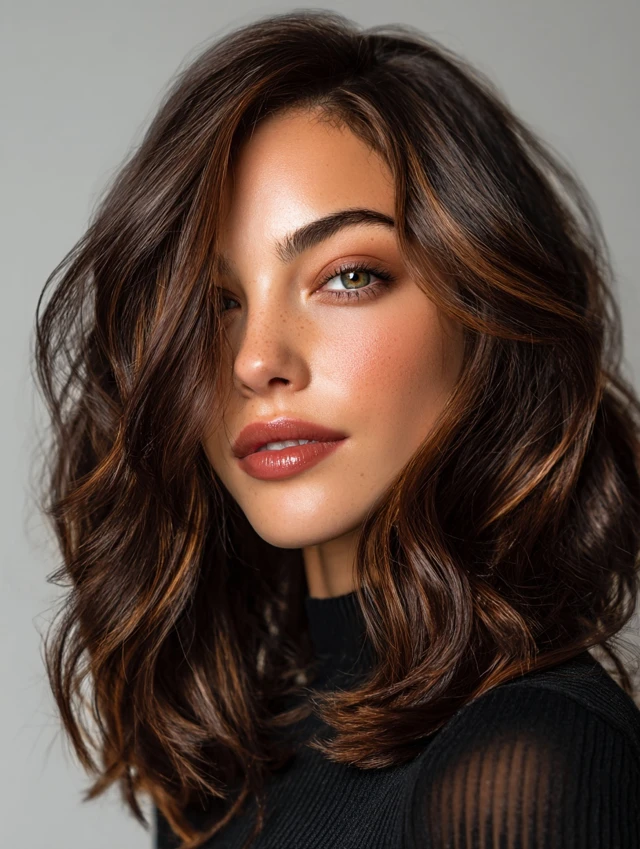Dark espresso brown with soft caramel or honey highlights adds dimension. Suits oval, heart-shaped, and round faces. Medium-length hair shows off highlights best.