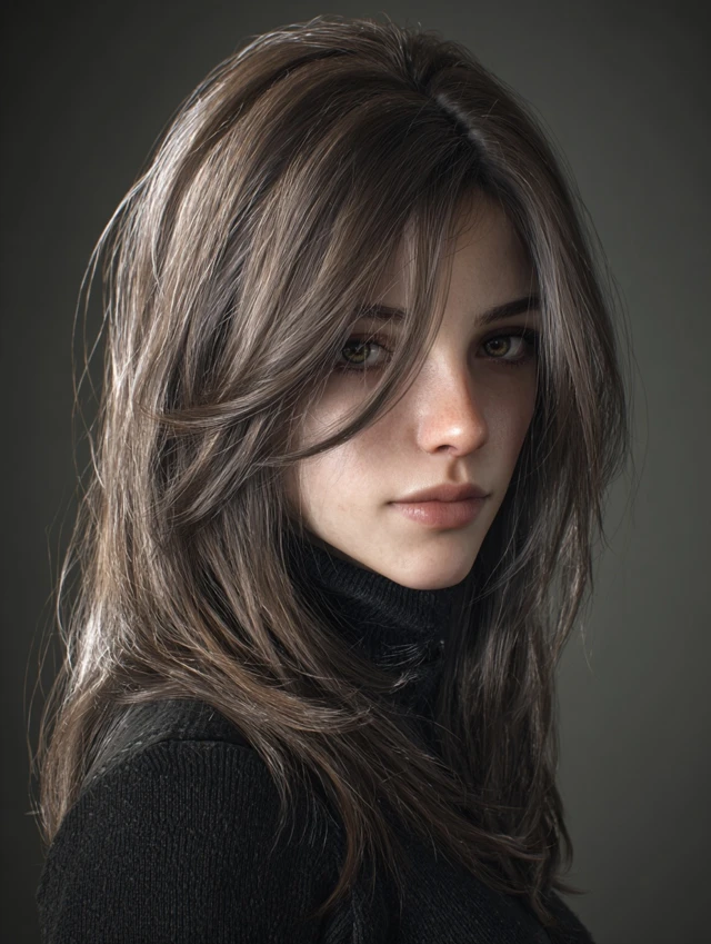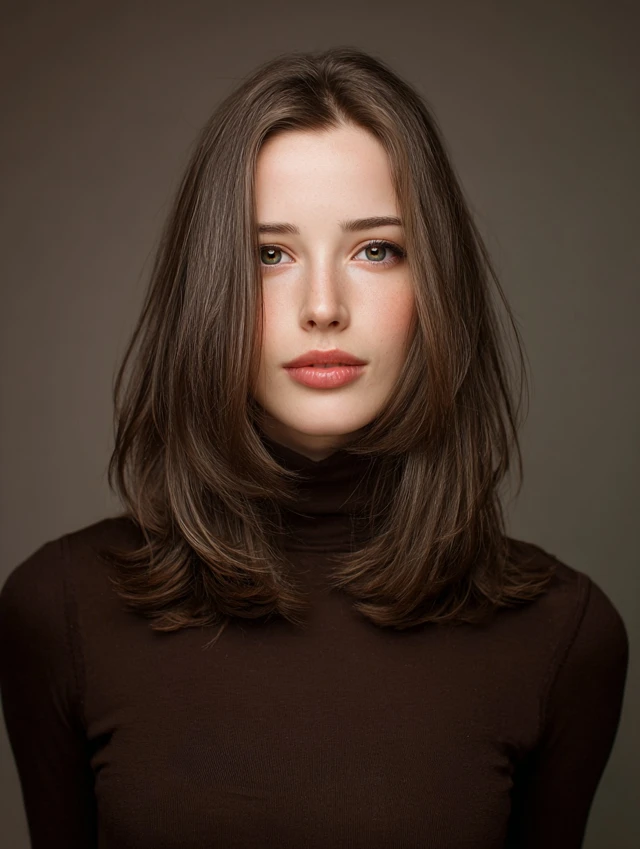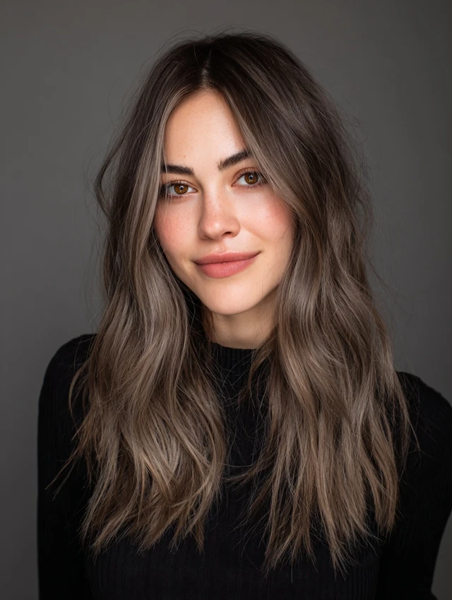 Mocha brown with faint silver or ash undertones creates a cool, luminous effect. Works for fair to medium skin tones. Medium-length hair is ideal for layered styling.