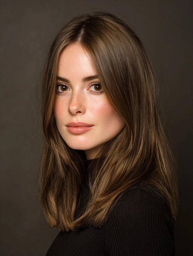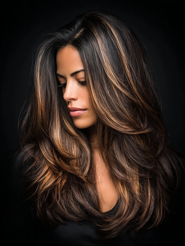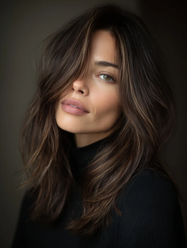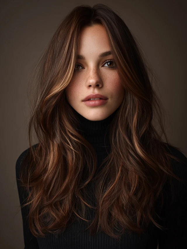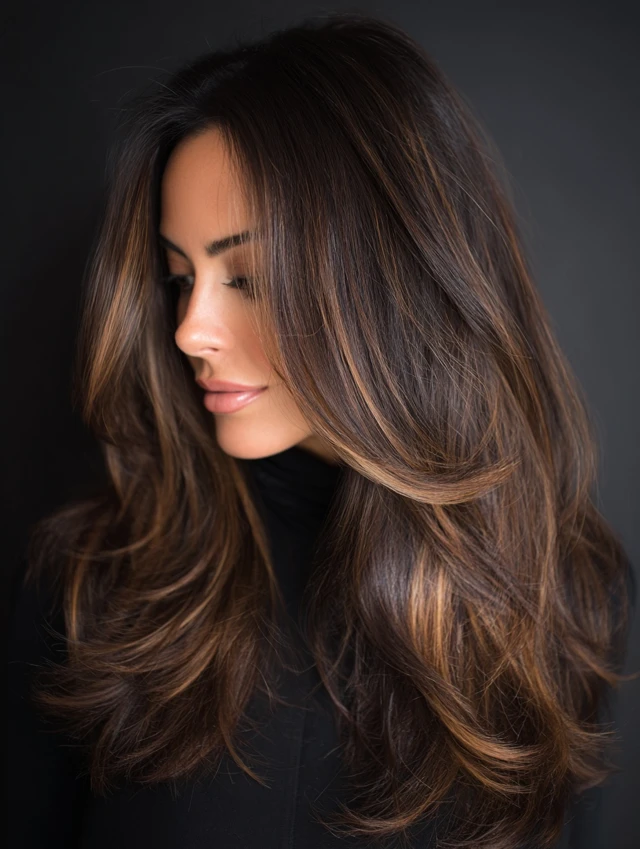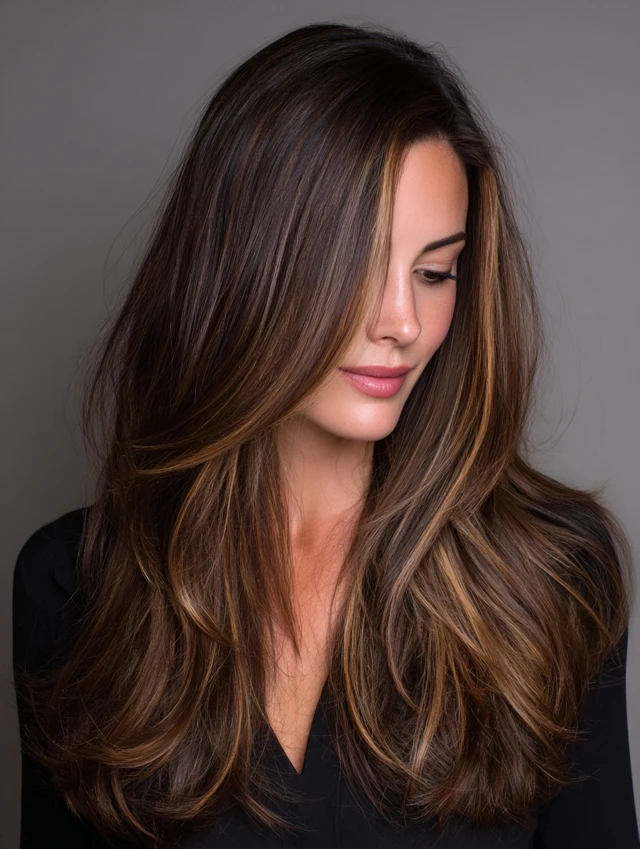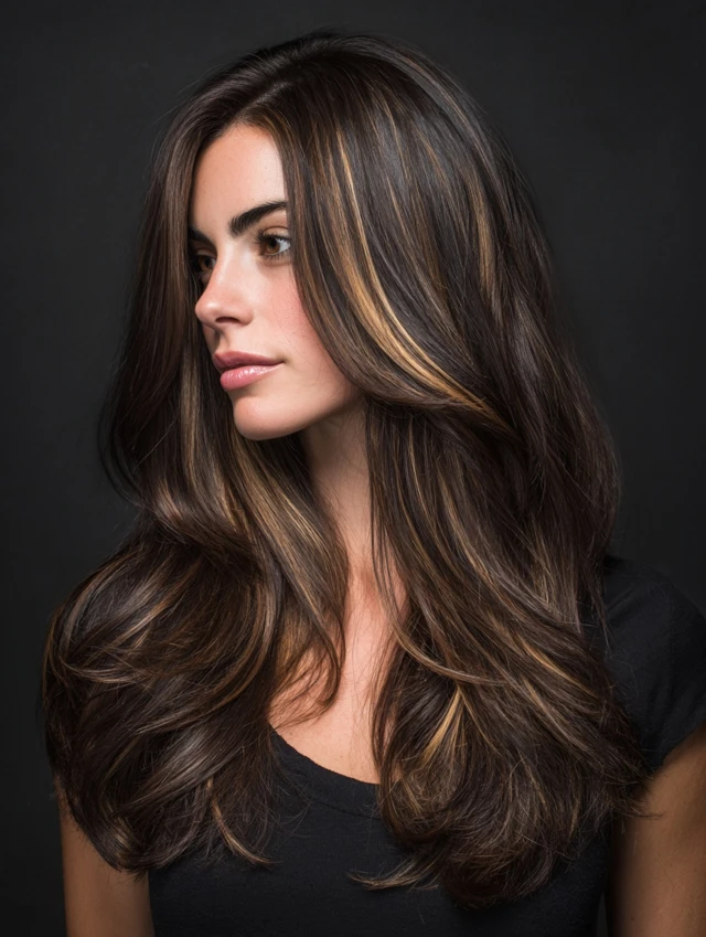 Subtle caramel highlights on dark brown hair bring brightness and dimension. Suits all face shapes and medium to long hair.