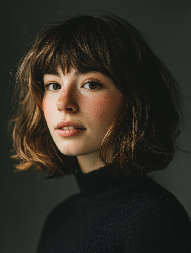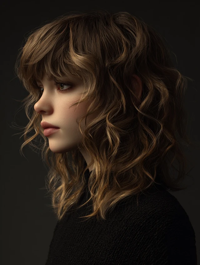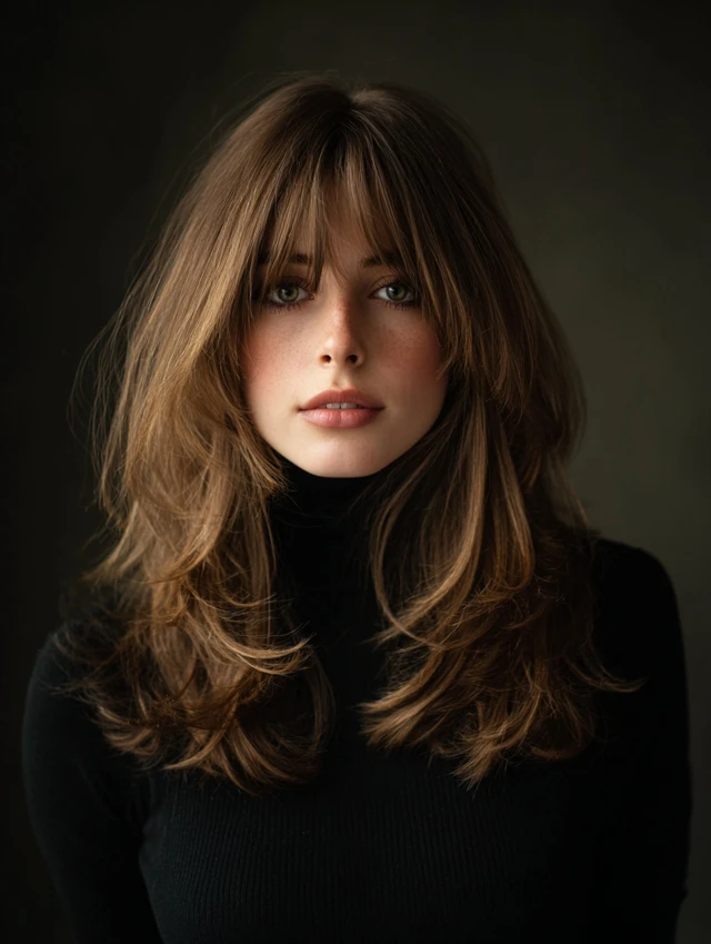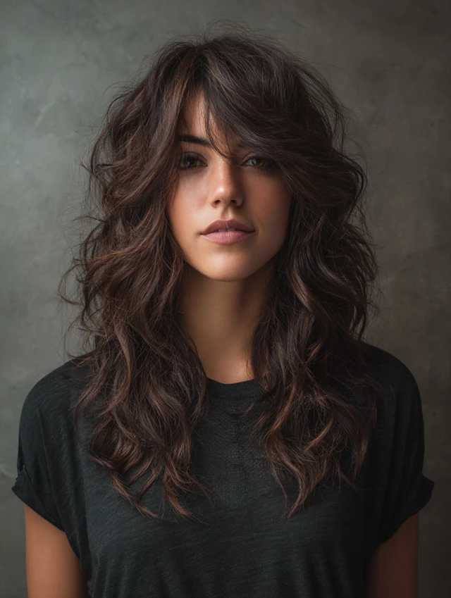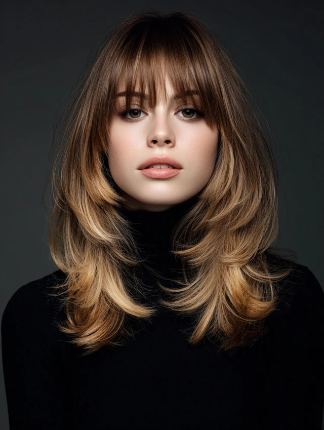 Incorporates soft or choppy bangs to frame the face while maintaining layered texture. Works for oval and square faces. Straight or wavy hair adapts easily.