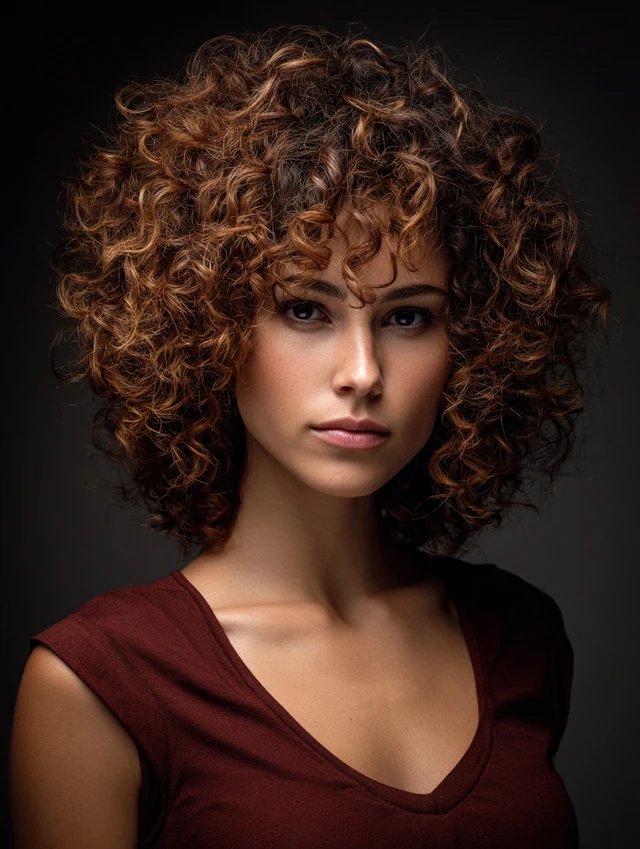 Curls integrated into an octopus cut create volume and texture. Works best for oval and square faces. Medium to tight curls define the layered ends.