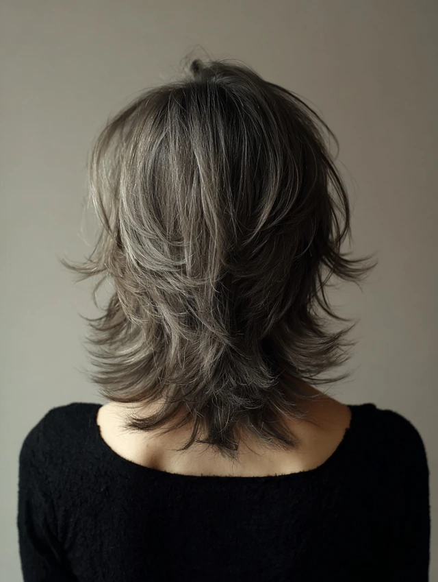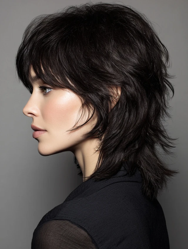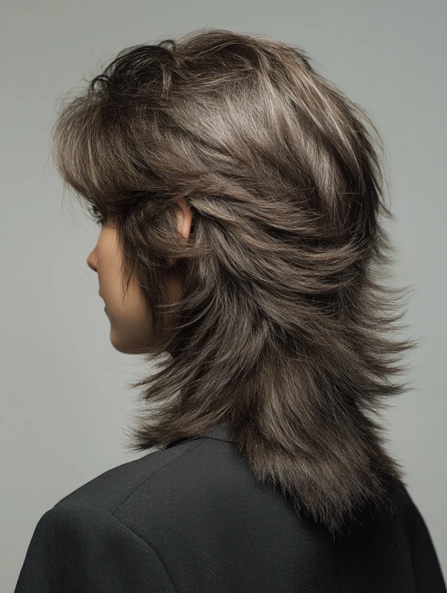 The wolf cut combines layered volume on top with longer strands at the back, creating a striking silhouette. This adds body and texture to fine or thin hair while maintaining edge and personality.