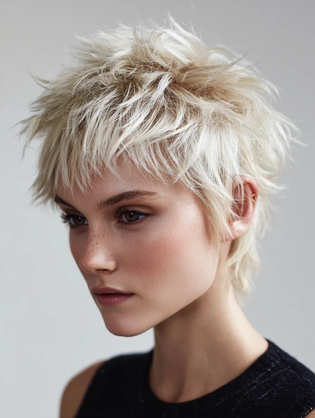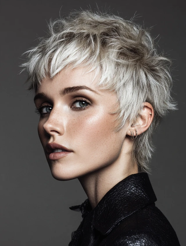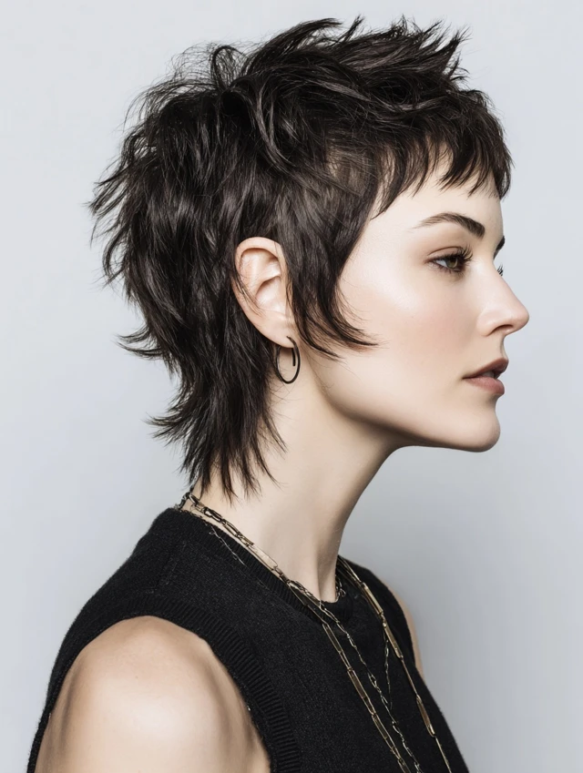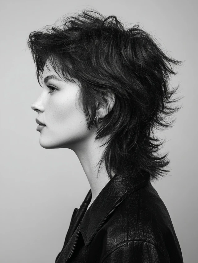 A cropped wolf cut with shorter layers on top and subtle length at the back. Best for oval and heart-shaped faces. Fine hair benefits from the added volume at the crown.