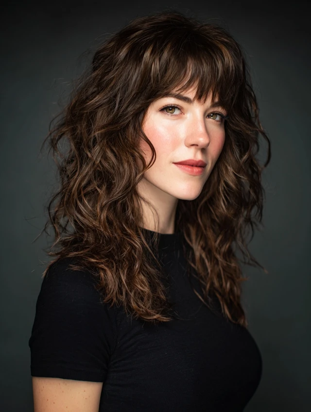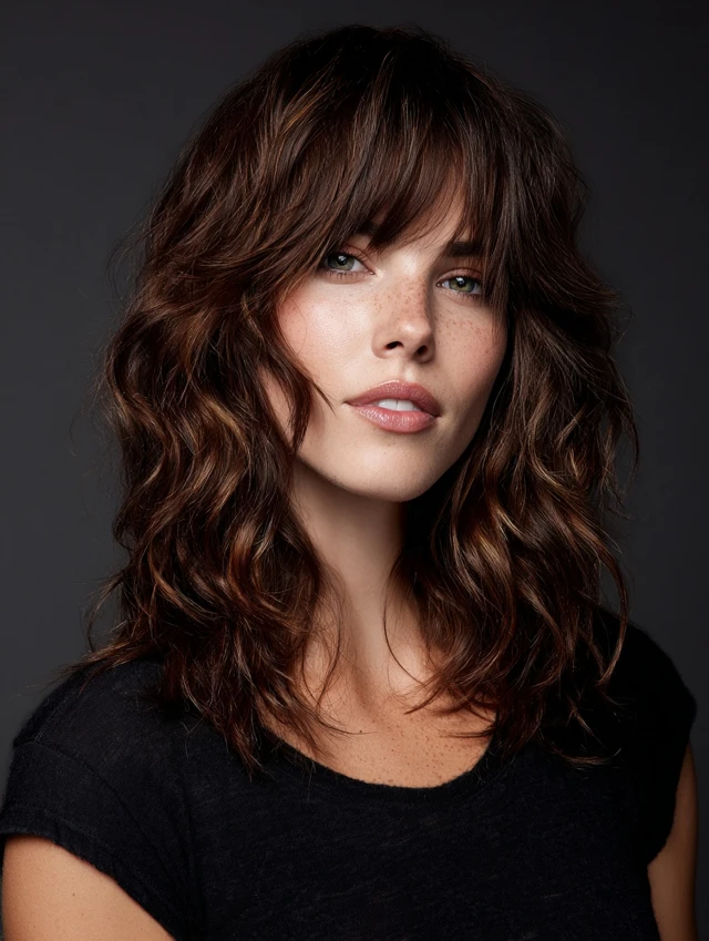 Adds choppy bangs to the layered wolf cut, framing the face while maintaining texture. Works for oval and square faces. Medium hair textures adapt well to bangs.