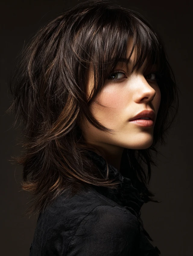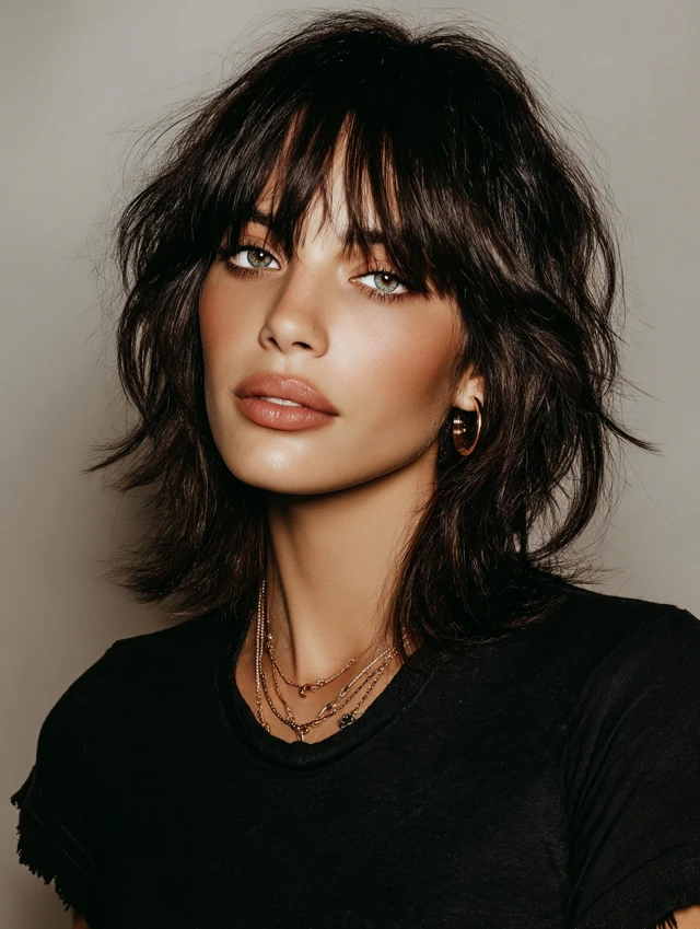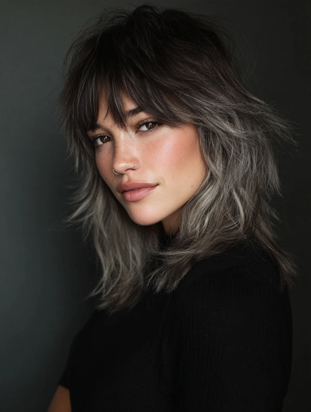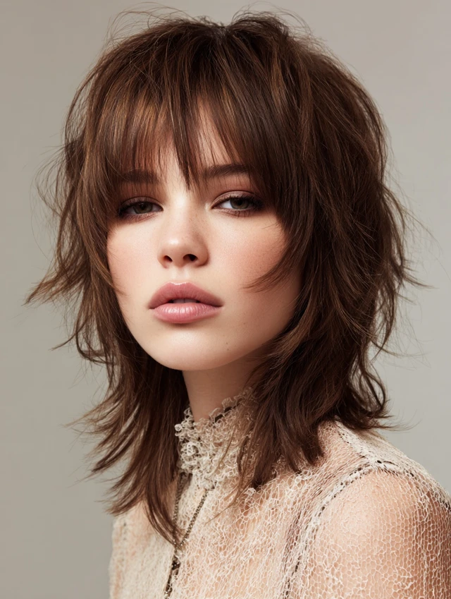 Perfect for casual and creative looks. Style bangs with texturizing paste or blow-dry for volume. The combination of layers and bangs enhances facial features while keeping a rebellious edge.