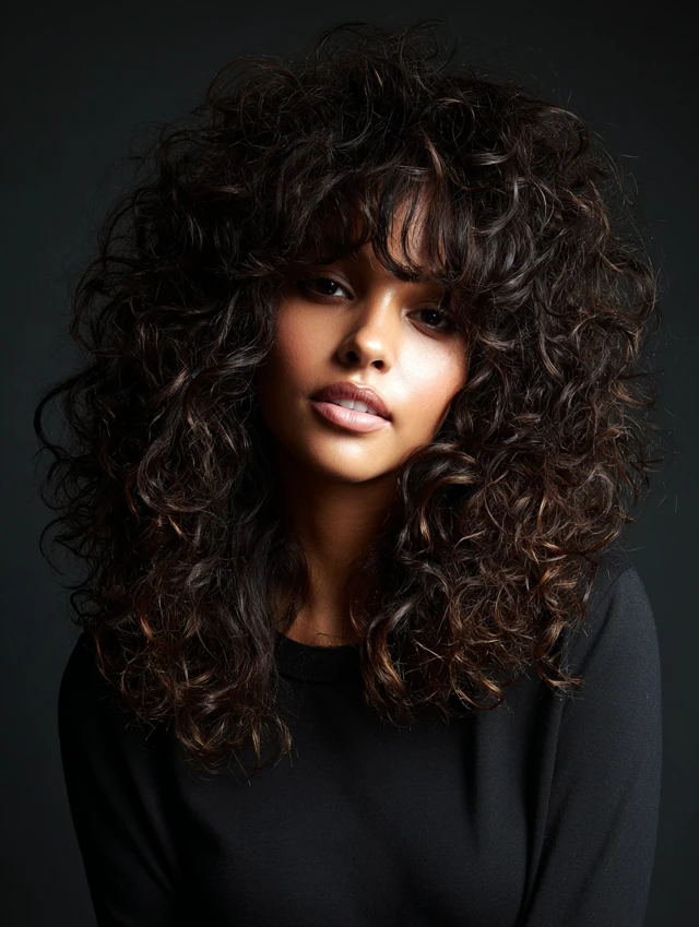 Natural curls layered in a wolf cut create volume and dramatic movement. Works well for oval and round faces. Medium to tight curls give the cut extra dimension.