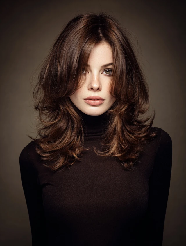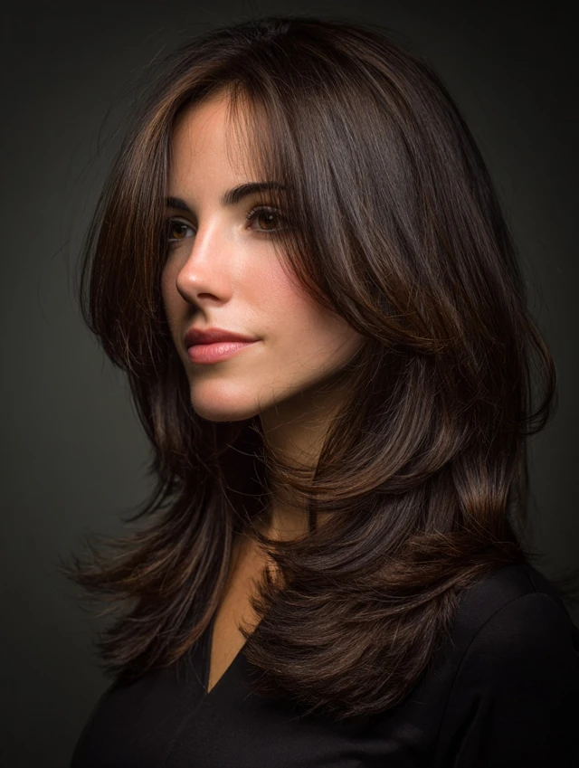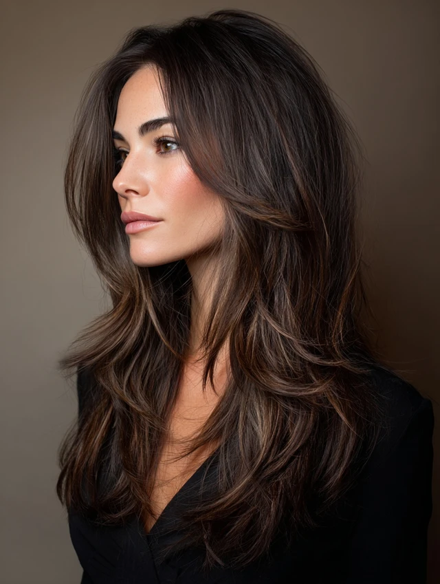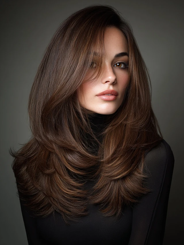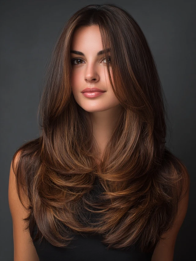 Features long, blended layers throughout the hair for natural movement. Works for oval, round, and heart-shaped faces. Straight, wavy, or curly hair adapts easily.