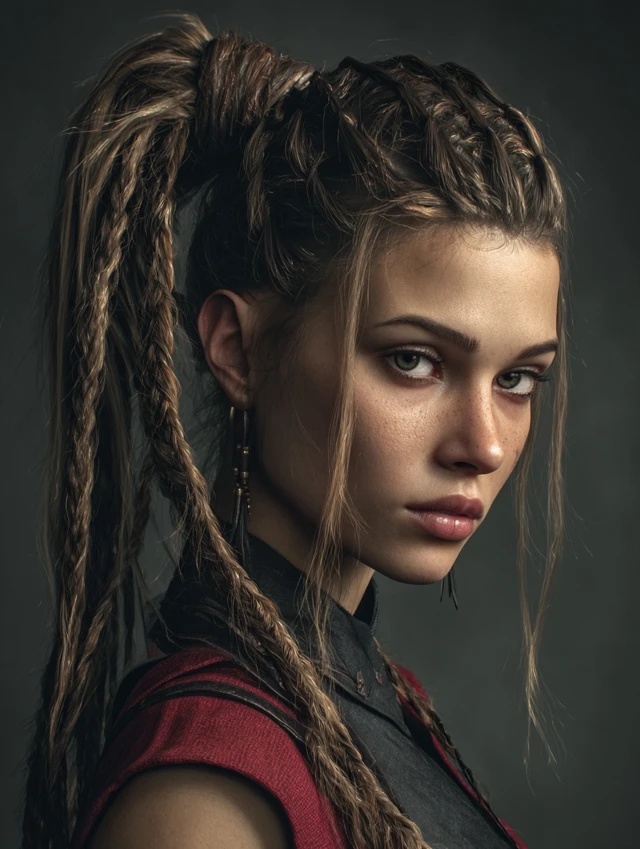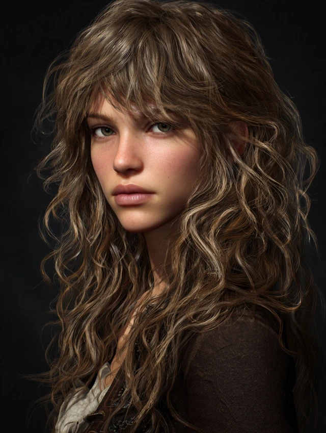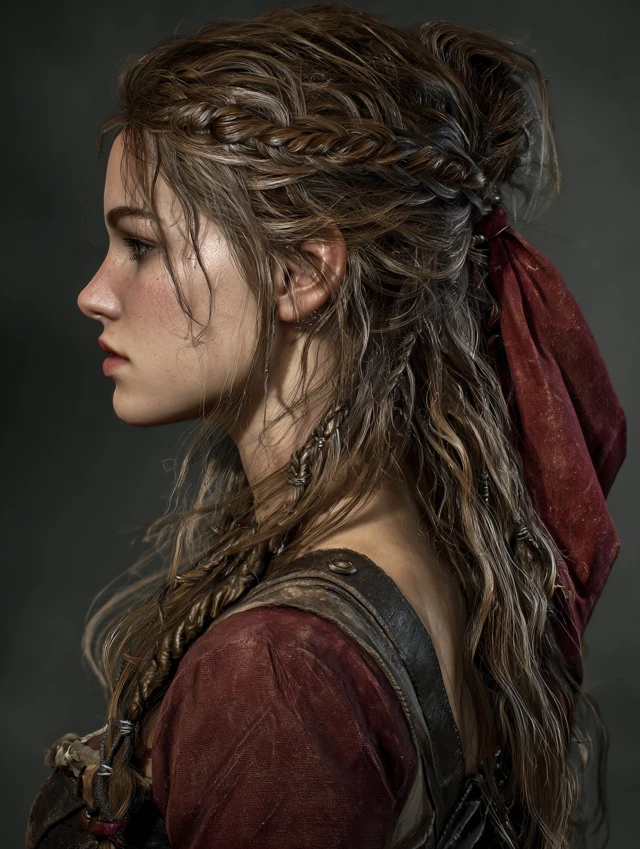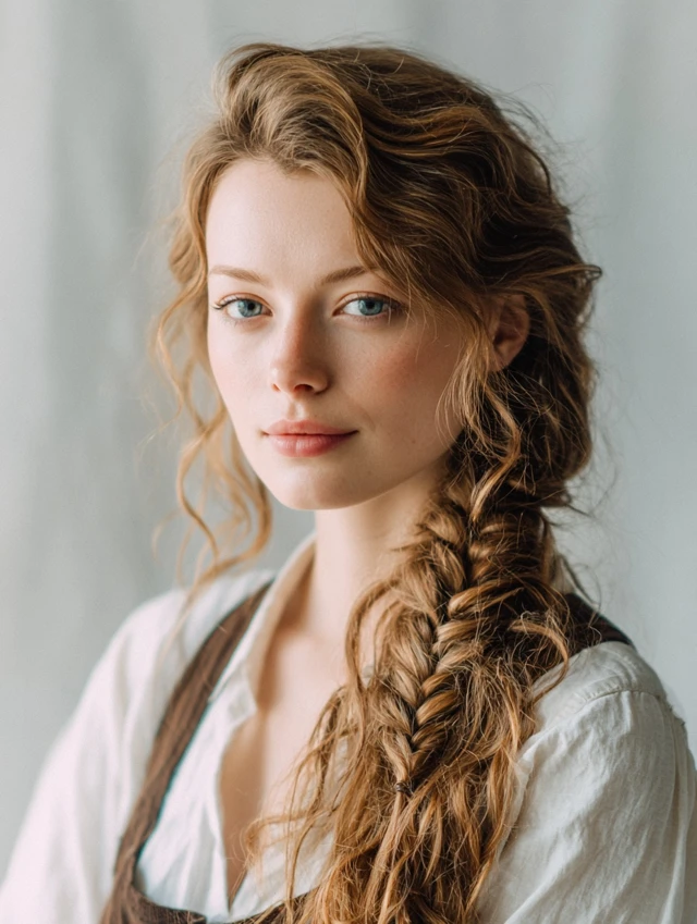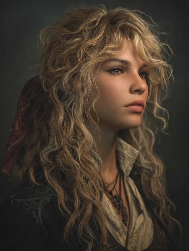 Soft waves combined with a single side braid create a rugged yet feminine pirate look. Works for oval, heart-shaped, and round faces. Wavy or curly hair enhances volume, while straight hair can be curled for texture.